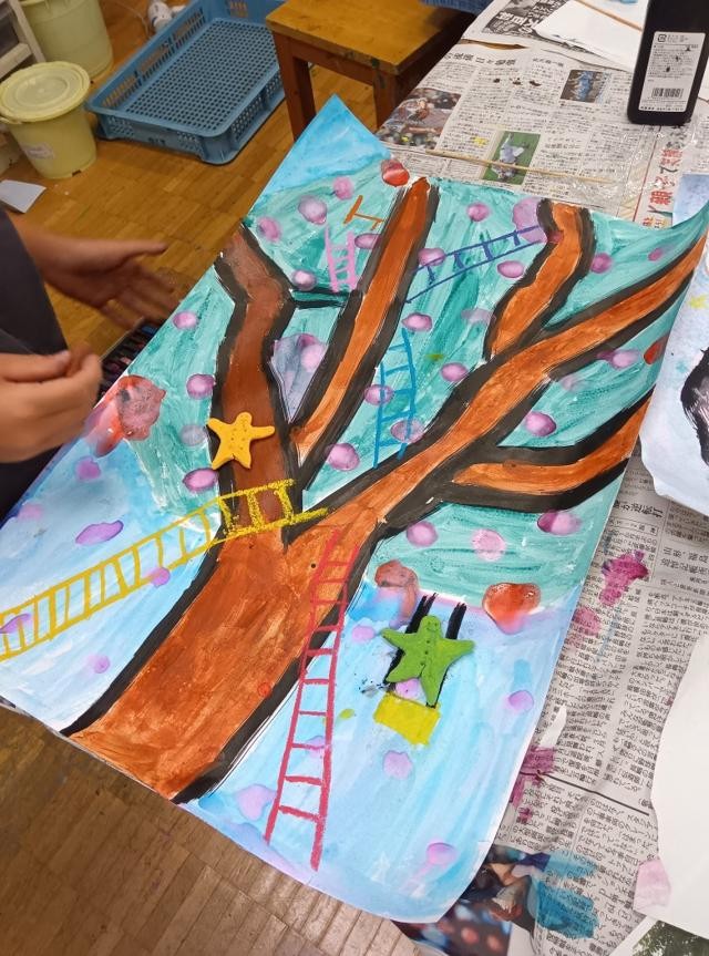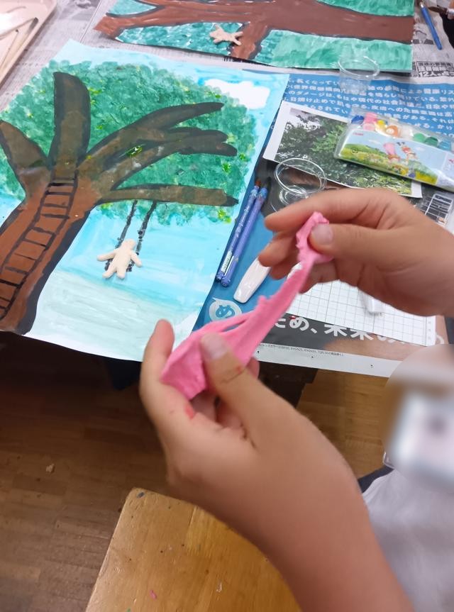 粘土で作ったキャラクターを実際に木に登らせていました。パステルを使ってはしごを加えたり、大きな幹にブランコを付けたりしています。木にしがみついて直接登っている人もいます。実がなっている木もありました。わあ、すてき。キャラクターを木に登らせながら、子どもたちはきっと自分が木に登っている気持ちになっていると思います。