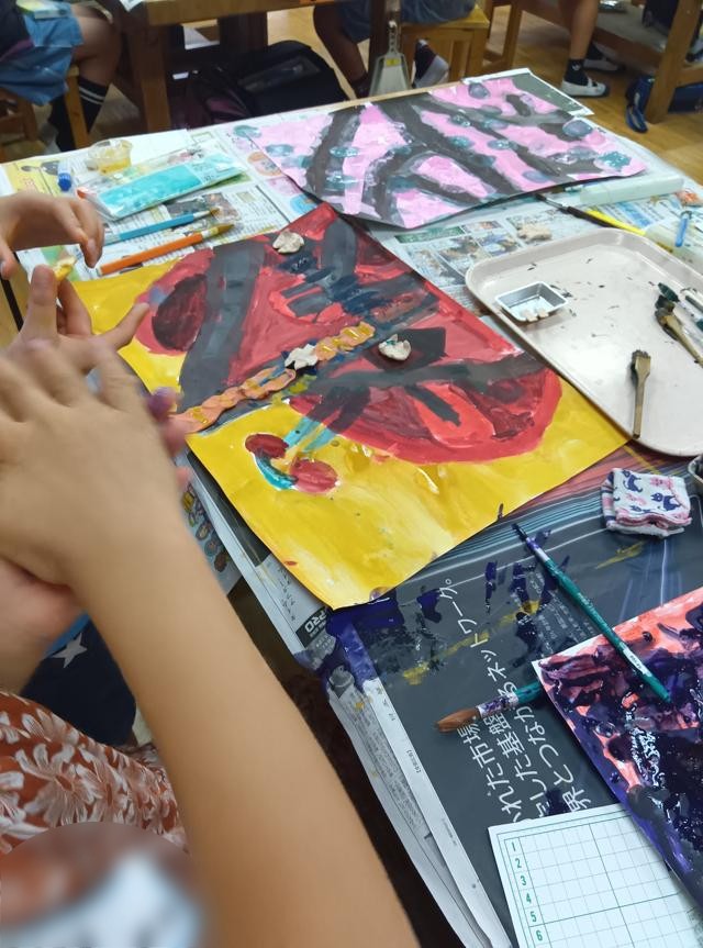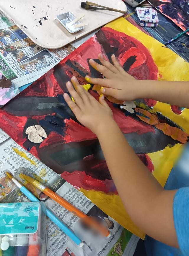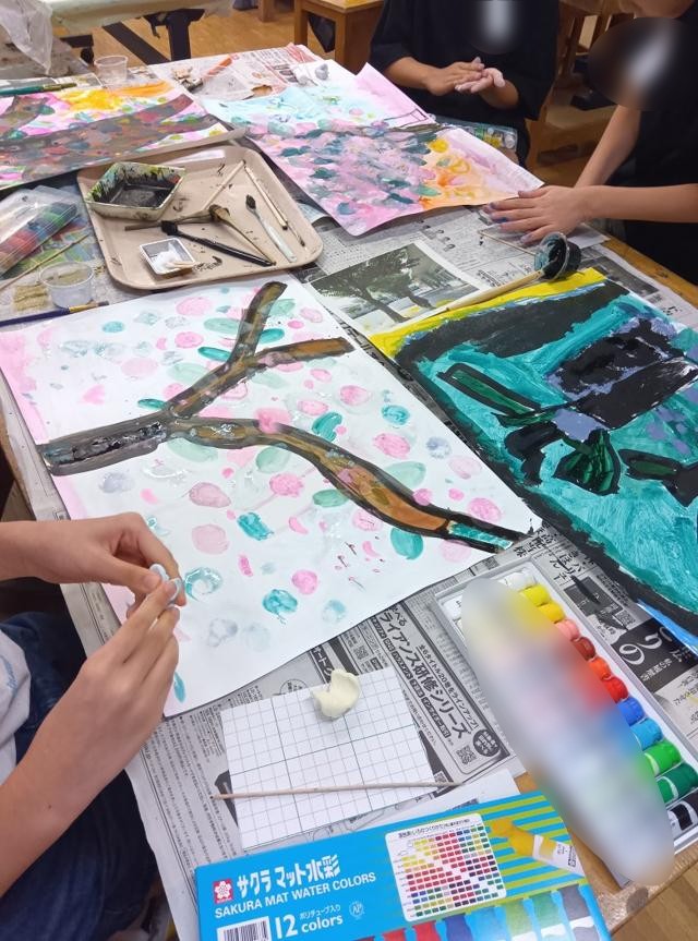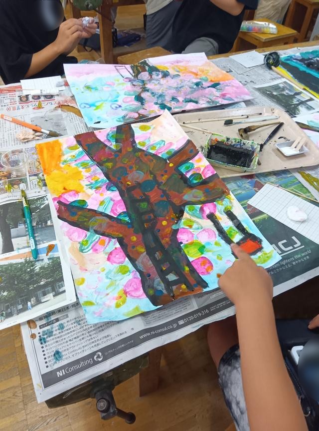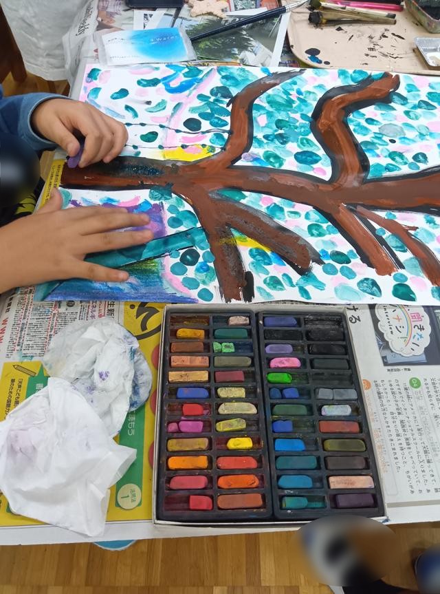 さらにイマジネーションが湧いたのか、木にも様々工夫をしています。部分的にパステルで濃い色を塗りこんで木の濃淡を表現したり、ぽたりぽたりと粒のように絵の具を置いて木の凸凹を表現したりしようとしていました。指でごしごしと塗り込んでいるのもその子なりの工夫なのでしょう。1枚の画用紙の中に、子どもたちの想像力、創造力がどんどん表現されていておもしろいなあと思いました。