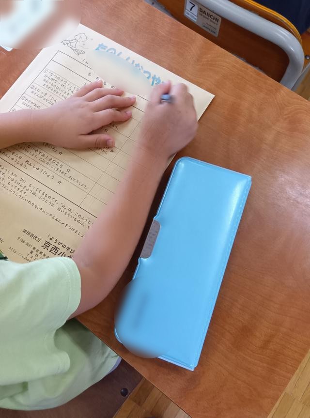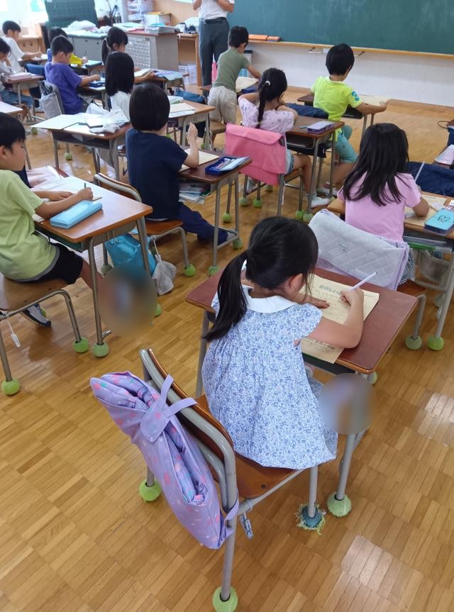 1年生は、配られた封筒から宿題を「出して」確かめ、名前を書いています。