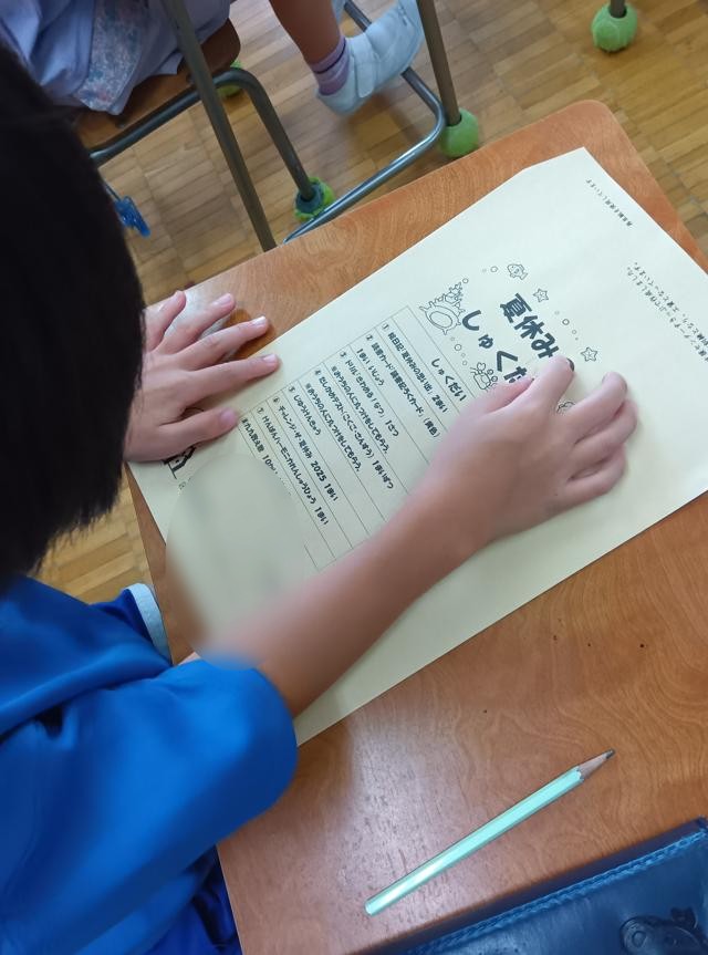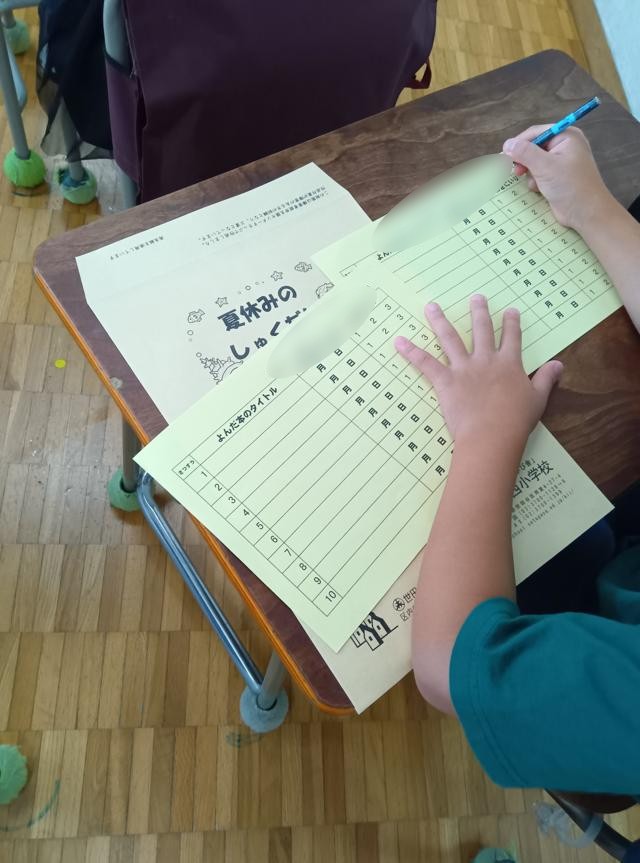 学期末、いろいろは配付物が配られます。各学年の宿題に関する配付物も配られていました。はじめの4枚が1年生、残りの3枚が2年生です。同じように見えますが、全く反対のところがあります。