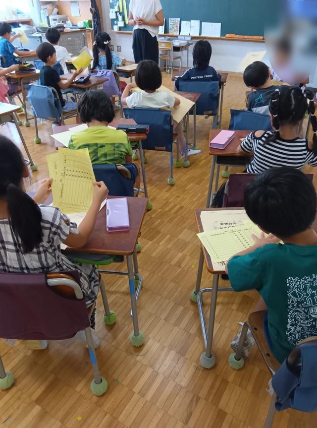 1年生の宿題は、先生たちが全て封筒にセットして入れてから配られているのです。一方、個々に配られて、確認しながら入れていくという方法でもしっかりと自分のものを把握してしまうことができる力がある、そして、限られた時間の中でささっと配る(受け取って、自分の分を取り、次の人に回す)ことができるのが2年生です。3年生以上ももちろん2年生と同じ方法で配付をしていました。ここは発達段階に応じて、です。1年生も来年の今頃はしっかりできるようになっているはずです。