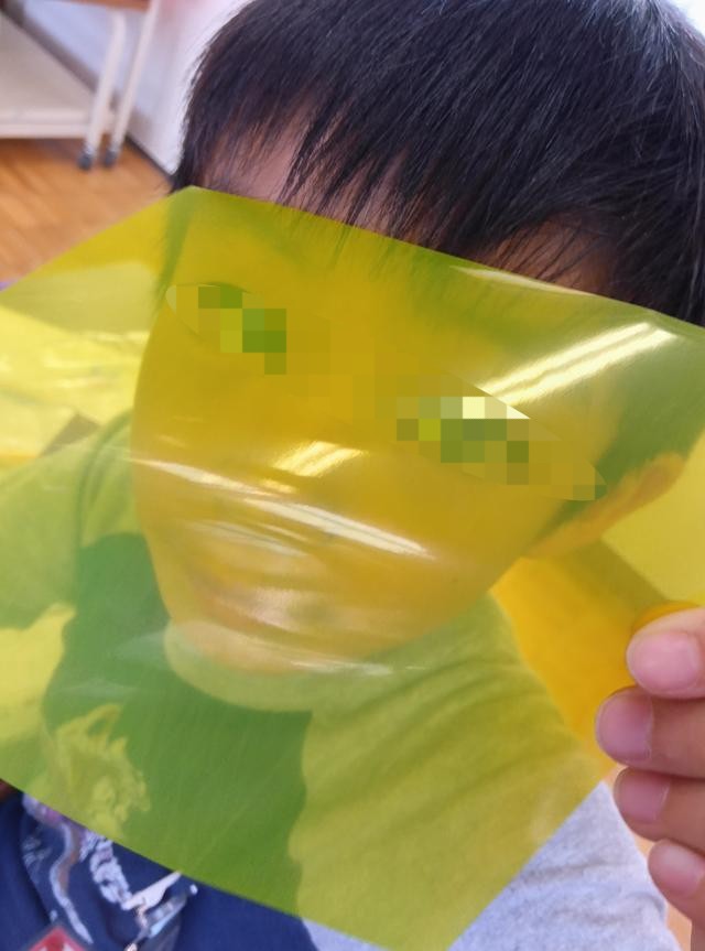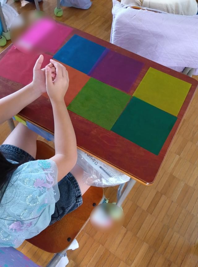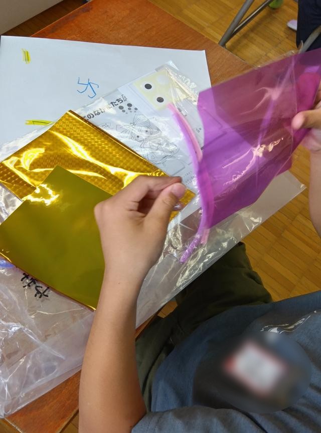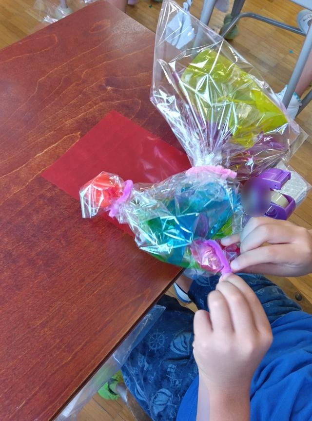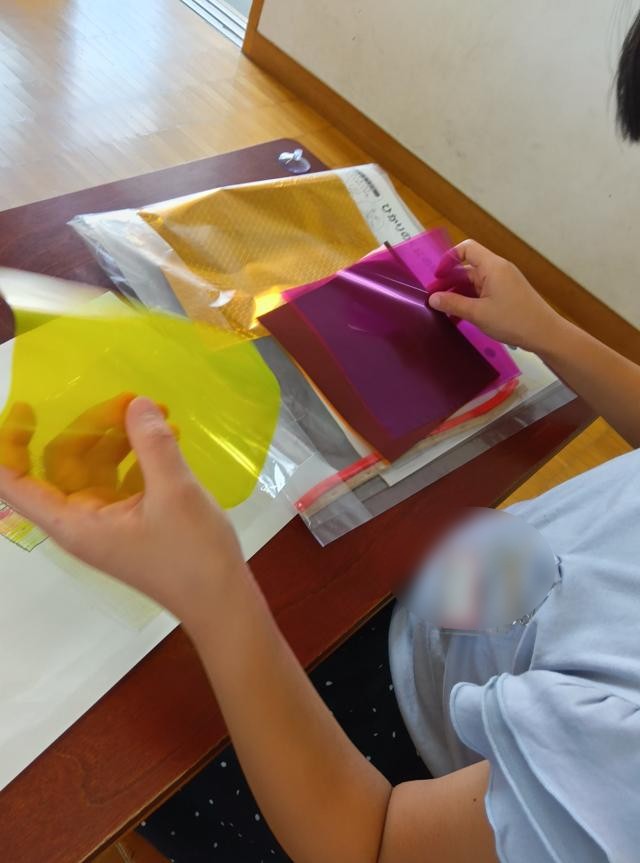 透明のビニル袋をベースの体にして、色とりどりのセロファンを使って「なかま」を作っていきます。セロファンの色は数色ですが、きれいな色がそろっています。更にセロファンは重ねることで新しい色を生み出すこともできます。重ねてセロファンを通して見える世界を楽しみながら配色についても考えていました。平面で使ってもいいですし、クシャっとして膨らみや別の質感を出すのもおもしろいです。
