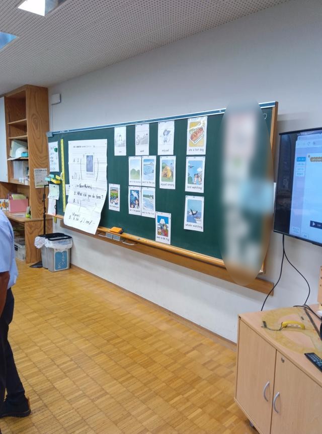 自分の行った場所、したことについても友達とやり取りをします。黒板には、夏に関係する表現がたくさん掲示されています。