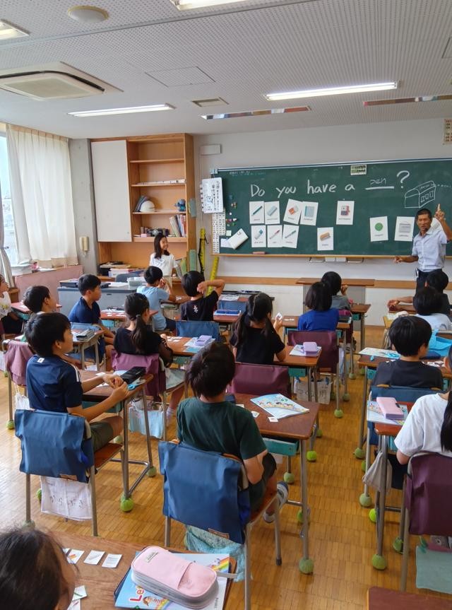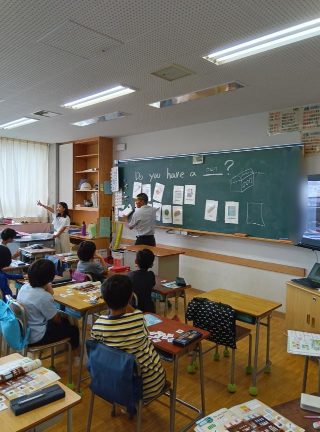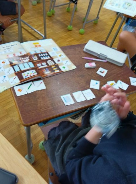 の表現を使ってゲームをしていました。今回素材になっているのは、「文房具」です。文房具を表す英単語とそのカードが黒板に貼られ、それぞれもカードを持っています。一人の子が前に出て、皆からの質問に答えていました。