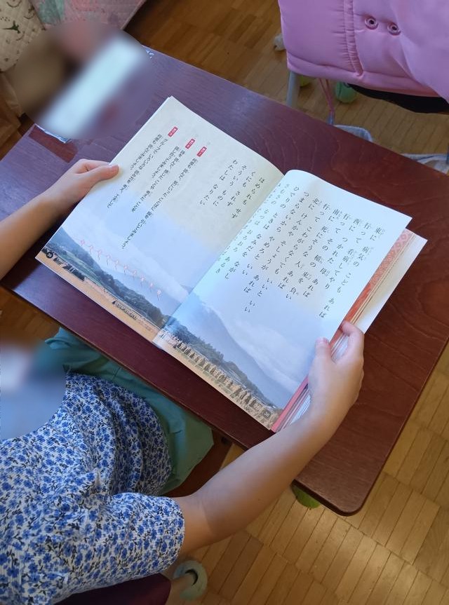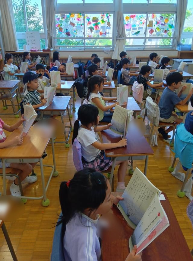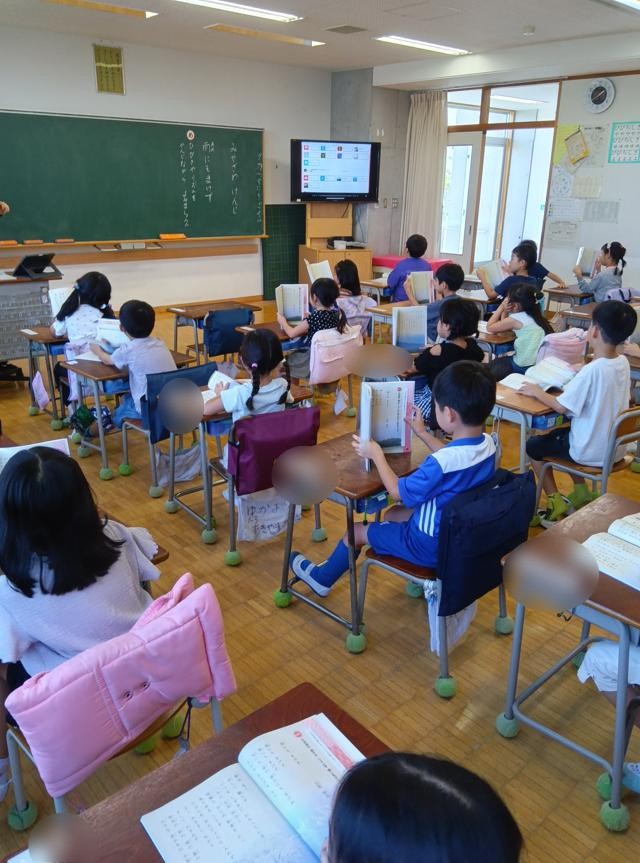3つ目の学級は、宮沢賢治さんの「雨にもまけず」を読んでいました。好きな文章を選んだり、繰り返し読んだりして作品を味わっていました。子どもたちはあっという間に覚えてしまうことでしょう。