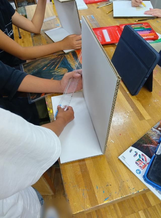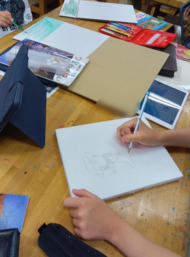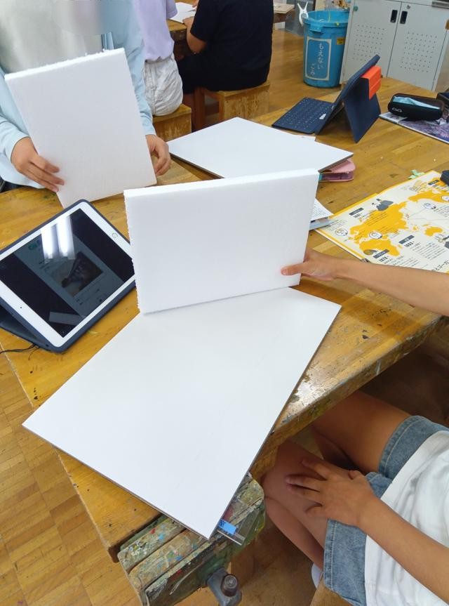 舞台となる部分は2枚の段ボール素材を90度に組み合わせて作ります。登場するキャラクターや物などは、発泡スチロールで作るようです。当然、生き物が登場しない作品もあります。それぞれが気に入った作品をどう表現して、さらに何かをどう足し、あるいは引き、デフォルメしたり、強調したりしていくか、作品鑑賞の力も試されそうです。今後の展開に期待しましょう。