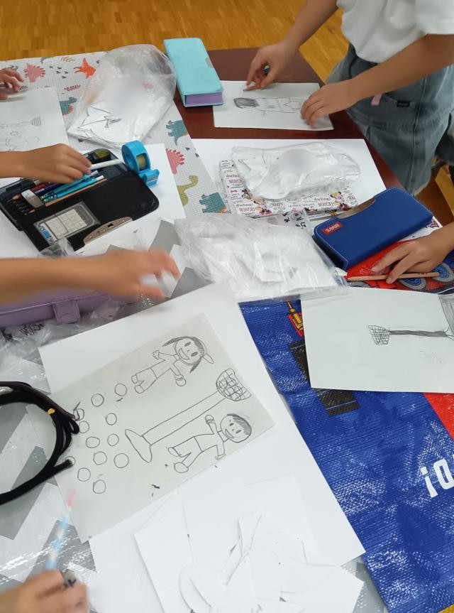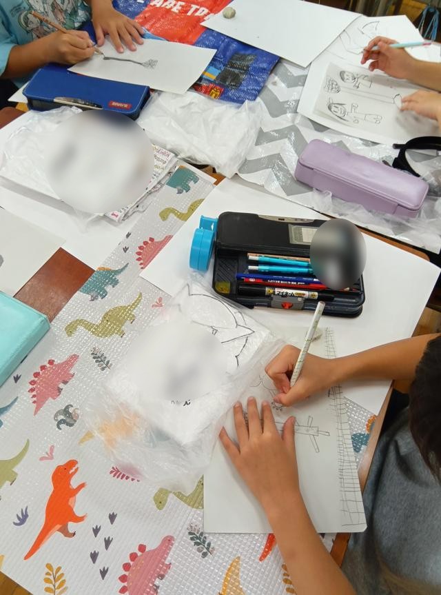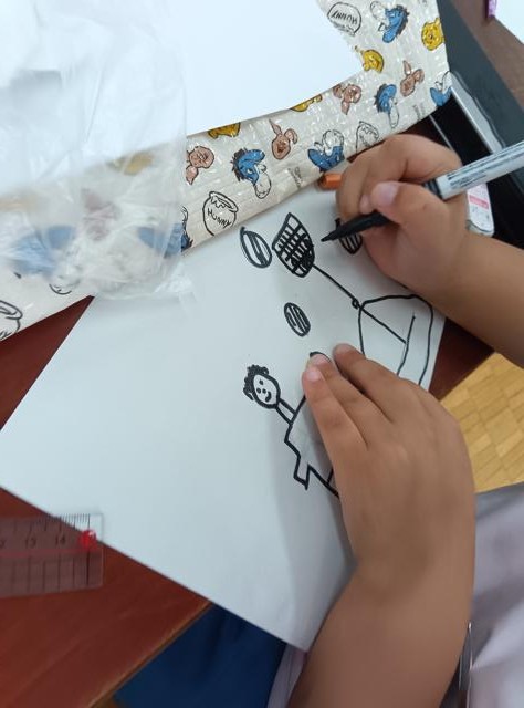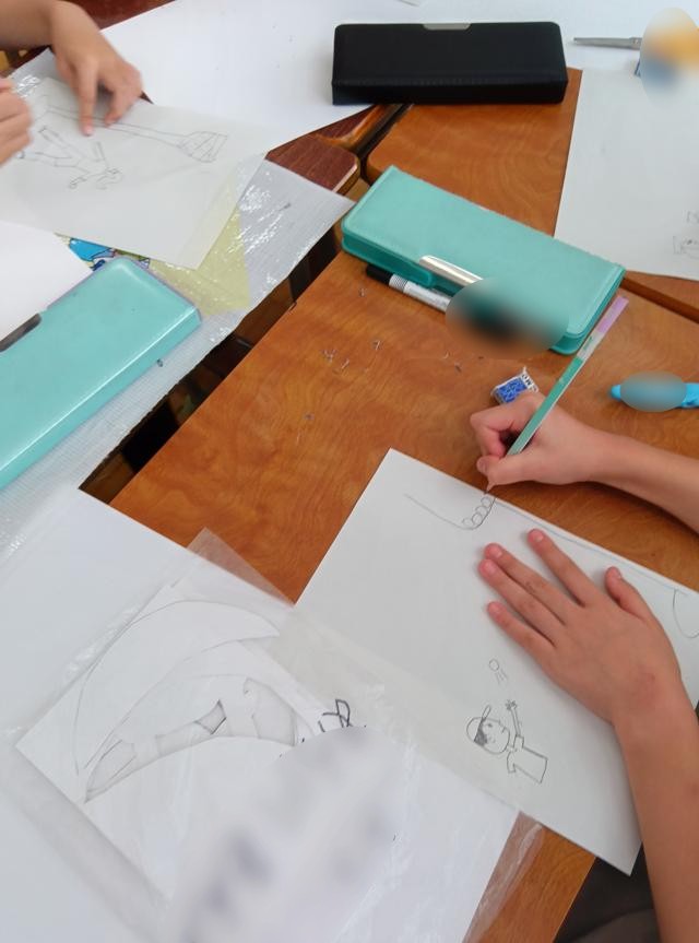 さて、このローラーの作業、前で3~4人ずつが出てきて行っていました。その他の子はぼうっと待って・・・はいません!順番を待ちながら、運動会のプログラムに使われれる挿絵に応募する絵を描いていました。ワイワイと運動会の話をしながら少し先の自分の姿を思い浮かべながら描いています。いい時間の使い方だなと思いました。