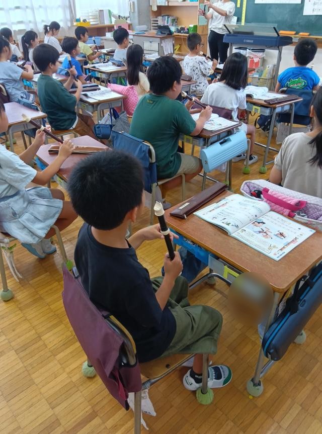 1学期の後半からリコーダーの練習に取り組み始めた3年生、初めは1音、2音での演奏から始め、使う音の数も増えてきました。今回の2曲では、