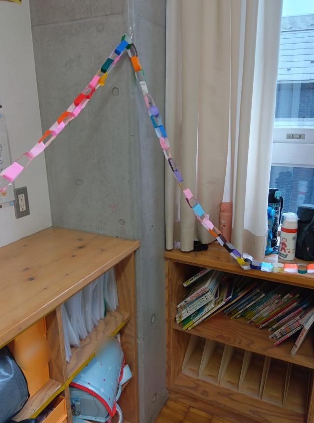 この輪飾り、教室を前面以外ぐるりとひとつながりで囲んでいます。写真で伝わるでしょうか。本当にすごいんです。転入生が2週目から来ると知った子どもたちが、暑くて外に出られない休み時間などにせっせと心を込めて作ったものだったそうです。かなり気持ちが込められたものだったから載っているのを見て喜んでくれたのだなと思い、今回は改めて写真を撮りに行き、別の記事の頭の写真に載せてみました。これならトップの写真にも出るので、気が付きやすいでしょうか。子どもたちからのHPの感想、反応うれしかったです。お礼の気持ちです。