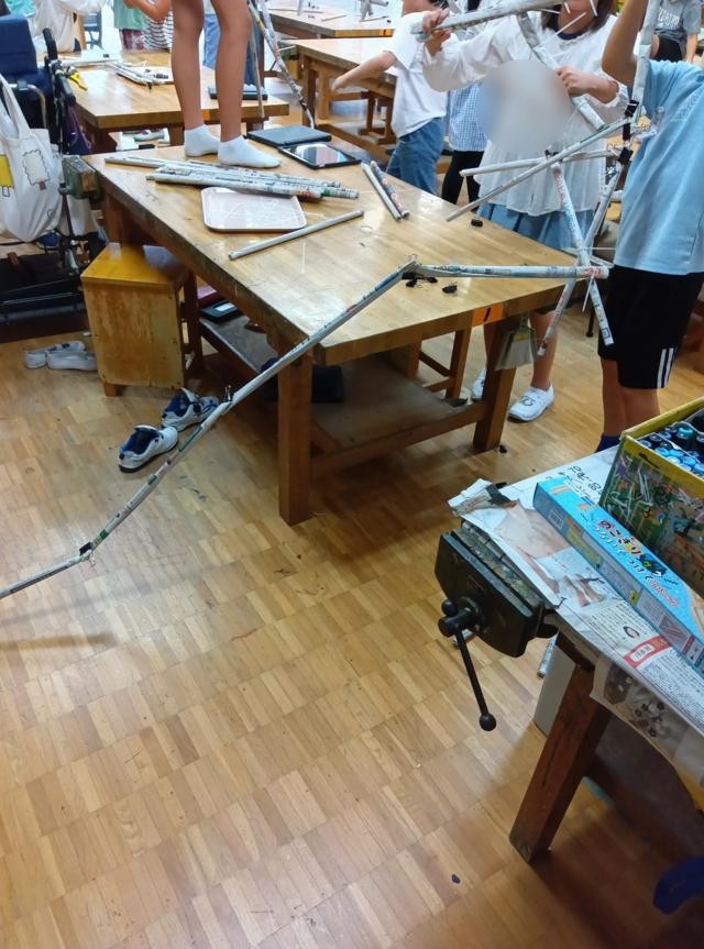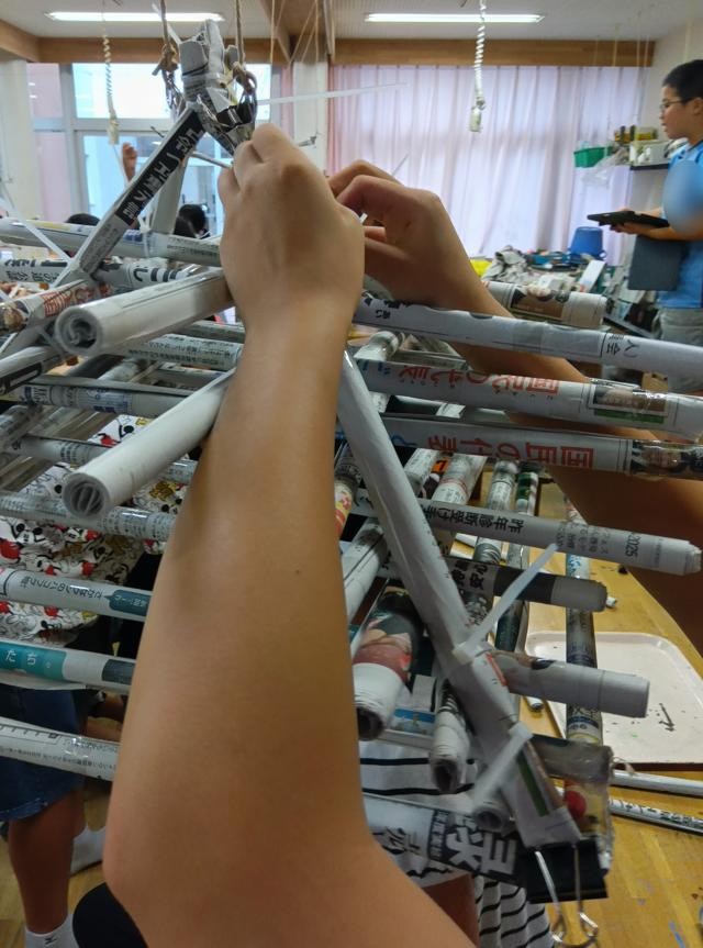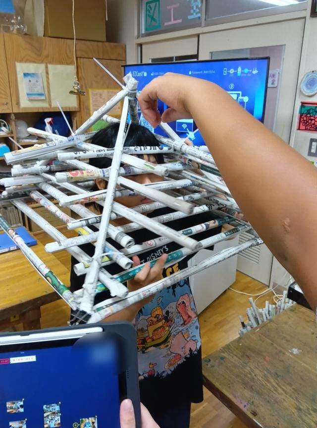 この学級では、天井から下りているひもの先についたクリップを使って空中に吊るすのが主流のようです。蜘蛛の巣のように横に広がっていくところもあれば、キャンプファイヤーの組み木のように縦横交互に、かつ先に向かって細くなる美しい形を作っているところもありました。ピラミッドパワーを感じます。