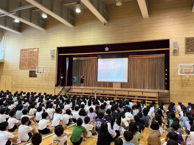 今日の朝の時間は、児童集会でした。集会委員会による「曲名当てクイズ!」が行われました。