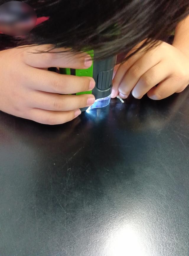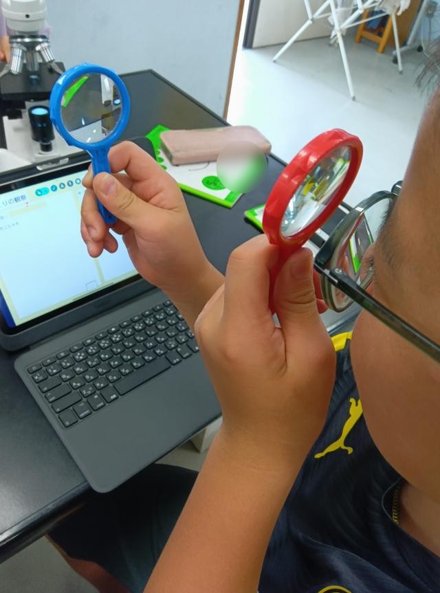 それぞれに合わせて道具を使い分け、観察を行いました。肉眼では見えないミクロの世界に子どもたちは驚いていました。途中、それを何とか写真に収めようという機運が高まりましたが、拡大したものを写真に収めるのはなかなか大変です。初めはなかなかうまくは撮れませんでしたが、徐々にコツをつかみ、見事な写真も撮れてきました。うまく撮れたものは、ロイロノートのノートに貼り付けてまとめに使っていました。