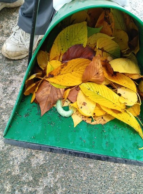 桜の葉が色づき始めています。ぽつぽつと黄色い葉があり、実がなっているように見えます。主事さんが、葉を集めていたら大きな緑色の幼虫がいたのを見せてくれました。寒くなると下りてきて壁沿いなどによくいるそうです。確か3年生の教室でも飼育されていたような・・・蛾になると思われますが、どんな姿に変わるのか楽しみにしておきましょう。