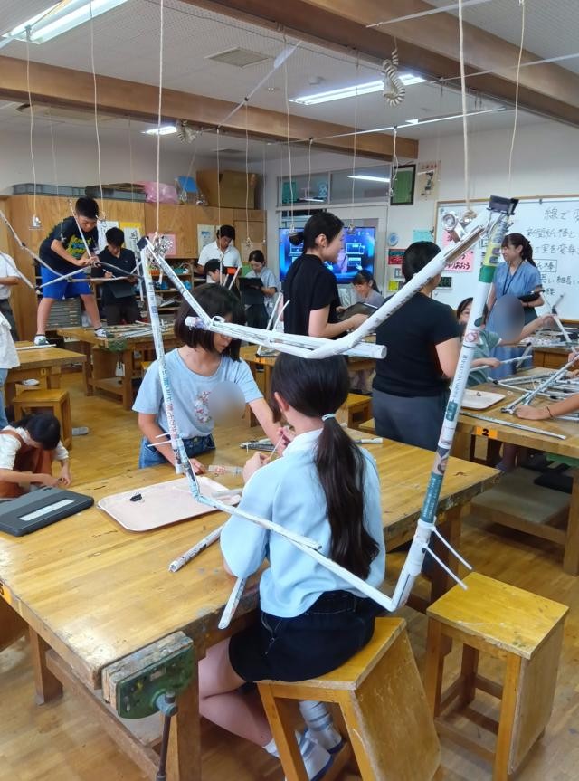 「材料と空間の特徴を生かして、図工室を変身させる」のが目標です。それを助けるものとして、図工室の天井からは、たくさんの目玉クリップが付いたヒモが吊るされ使えるようになっています。