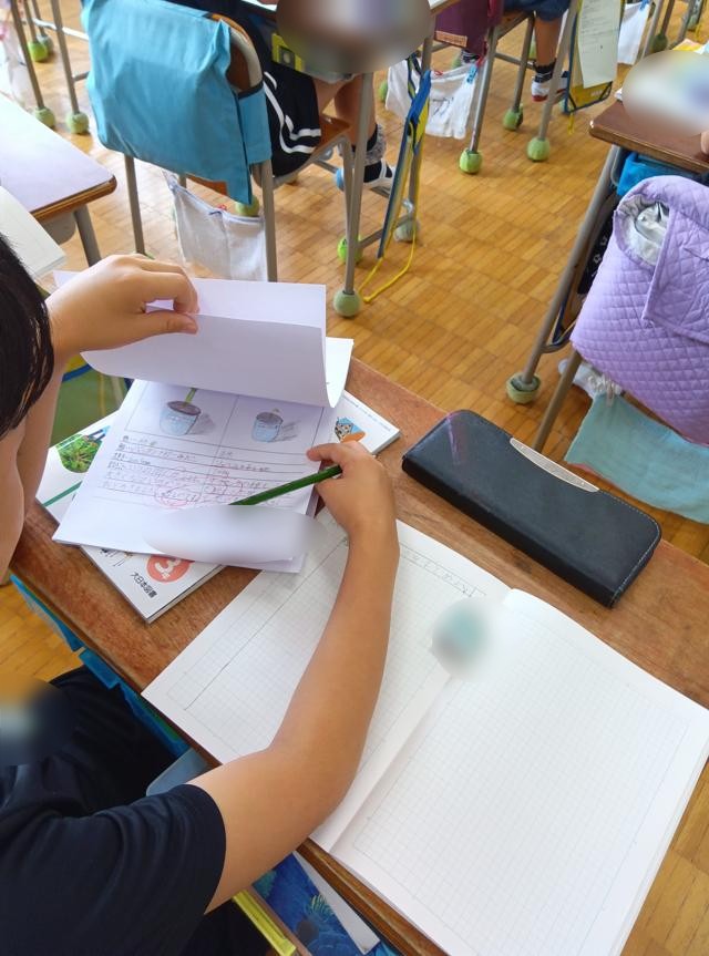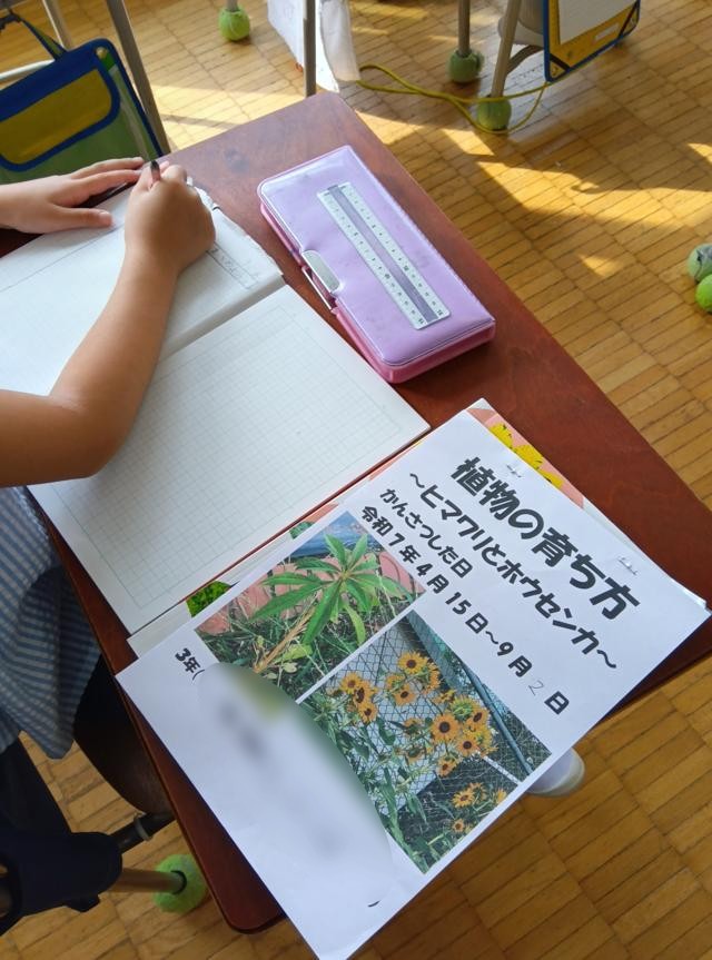 3年生の理科です。ひまわりとホウセンカの生長の記録を綴じ、「植物の育ち方」としてファイルにまとめていました。