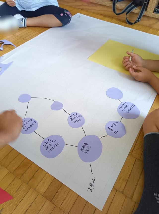 という奇跡が!なぜこうなったのかちょっと不思議なくらいで(決して先生がすごろくを激推しする様子はありませんでした。)、適当に散らばるのではないかという感じの流れでしたが・・・見ている私もびっくりしました。かくして始まったすごろくづくり、実に楽しそうです。