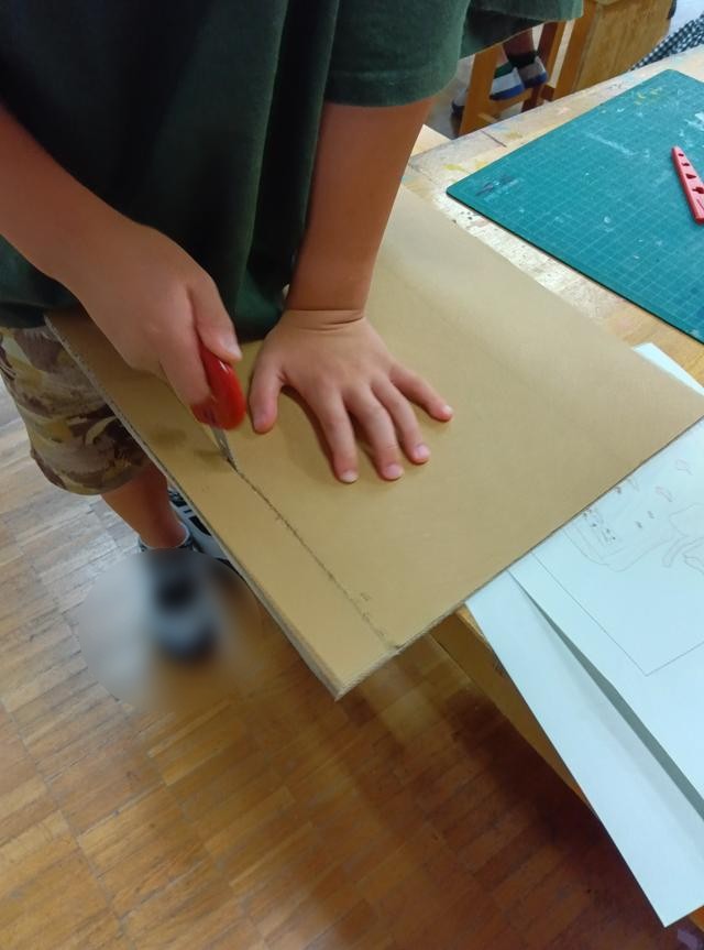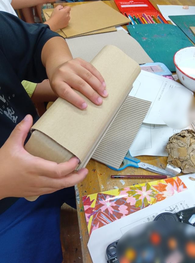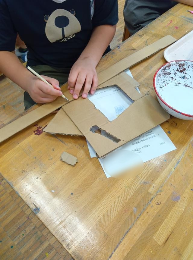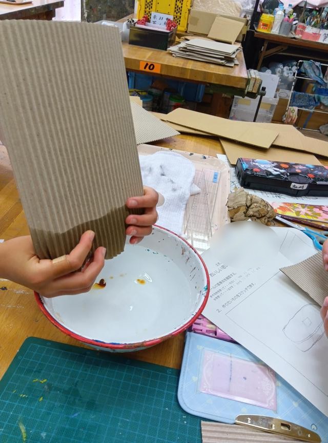 ということで、材料のダンボール。そのまま使うこともあれば、いろいろと工夫をして姿を変えて使ったりもします。切る、折る、貼るは当たり前!はがす!むく!ちぎる!そして、水につける!など、様々形を変えながら使用していきます。まさにダンボール七変化!この日は、作品のイメージづくりとダンボール加工の練習です。