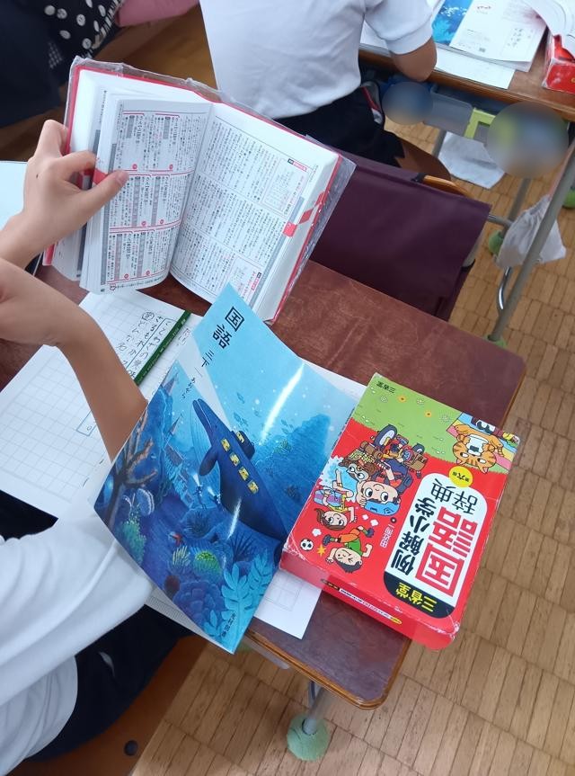 国語辞典を使って3年生が学習をしています。ことわざや故事成語についての学習です。教科書や本、国語辞典を使って、ことわざや故事成語の意味や成り立ち、使い方を調べています。