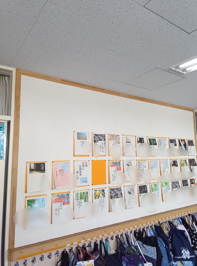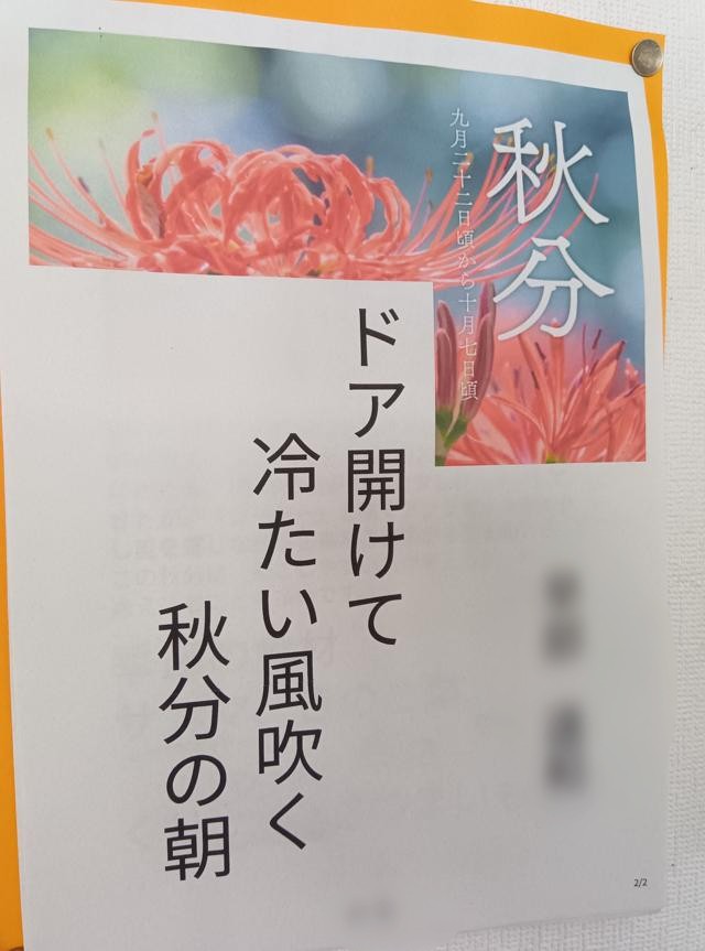 6年生の教室の廊下の掲示板に、二十四節気とそれに関する俳句の掲示があります。今日、パッと目に入ってきたのが1枚目の写真「秋分」です。