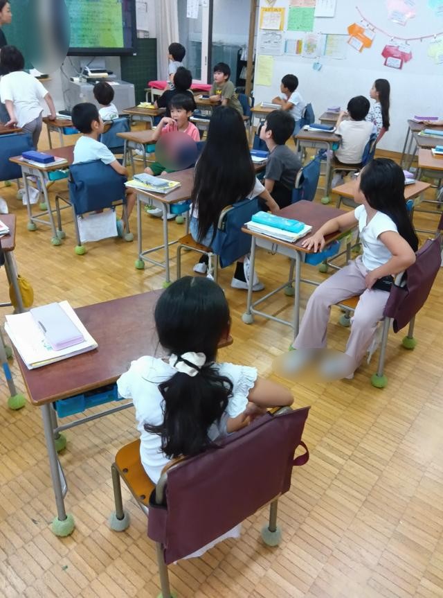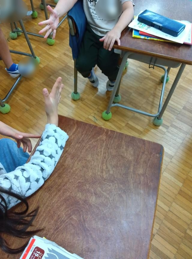 2年生の国語の授業、最初のわずかな時間で「アドジャン」をやっていました。前に一度紹介しましたが、アドジャンとは、「アド・ジャン!」と言いながら、ジャンケンの要領で指0本(グー)から指5本までのいずれかを出し、出された指の合計数で指定された質問に答えながら会話を楽しむコミュニケーション活動です。
