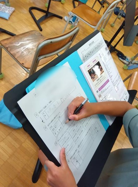 さて、待っている児童は、次に取り組む曲の楽譜に音階を書き込んでいました。それから前に行った鑑賞の感想でしょうか、プリントに書き込んでいました。