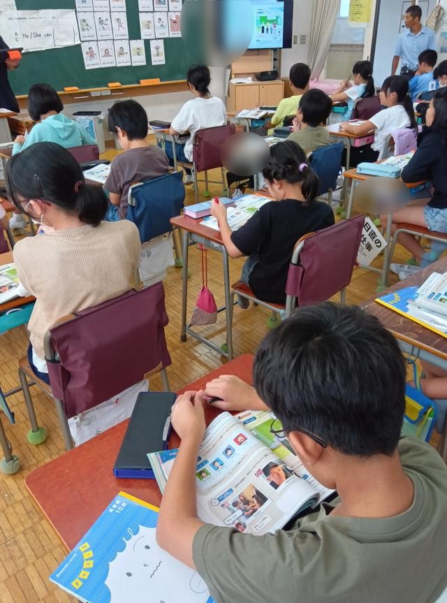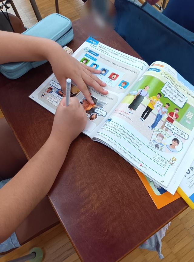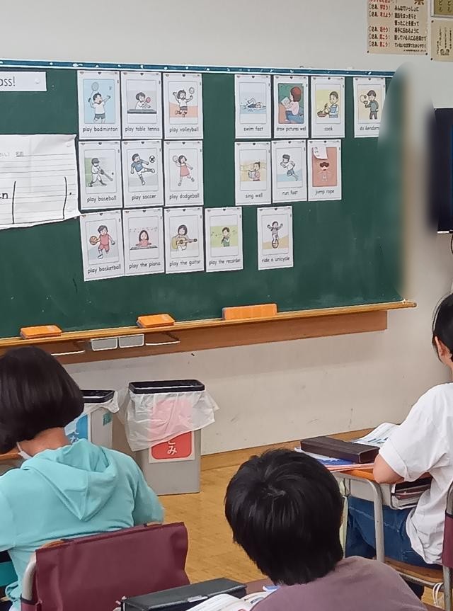 5年生の外国語の学習、リスニングをしています。単語は、スポーツや日常の動作を表す言葉が並んでいます。