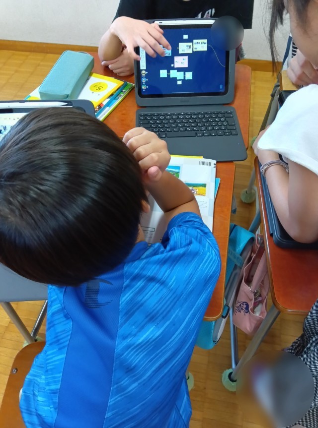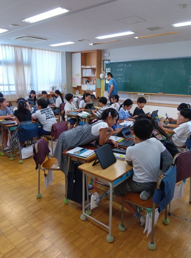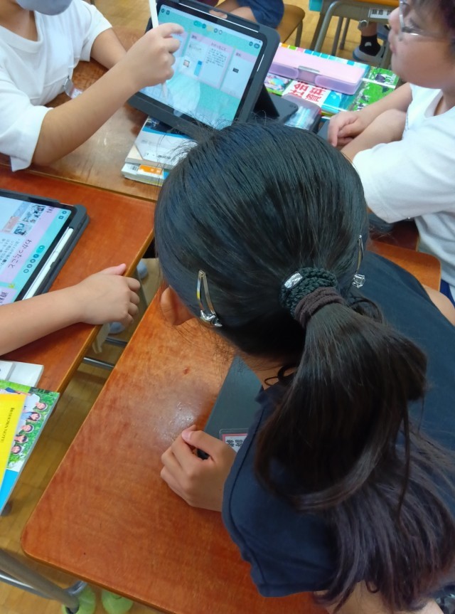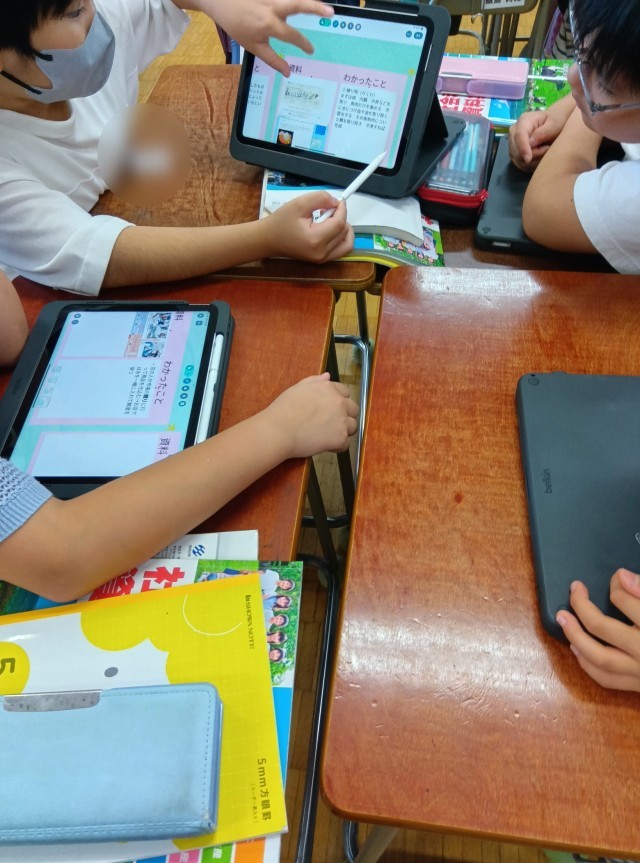 さて、「聞く」ということでもう1つ、社会科で調べたことを発表して共有しているところです。こういう機会は学習の中で日常的にあるので、発表の仕方も様になっていますし、聞く方もそれを自分のものにしようとしっかり聞いていました。形だけの共有にならず、知識や考え方もしっかりとシェアしていくことができれば、自分だけではできない知識を得ることができたり、効率よく調べることができたりします。新しいタブレット端末にもすっかり慣れてきているようです。タッチペンもうまく使ってくれていてうれしいです。ただ、落とすと一撃で壊れる可能性がありますので、これまで以上に注意して使ってほしいと思います。