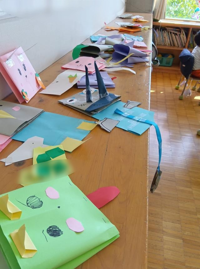 1年生の教室、ロッカーの上には先日作っていた「パクパクさん」が置かれ、窓には何度か紹介した「ひかりのくにのなかまたち」が飾られていて何だかすてきな空間です。