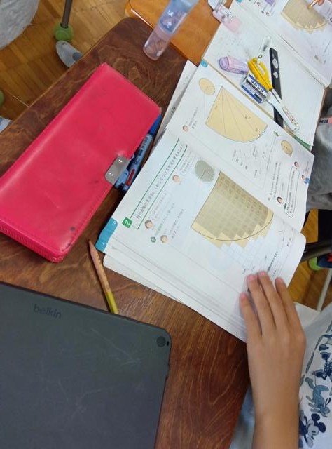 円周の求め方も円の面積も求めるための公式がありますが、ただ公式を覚えて問題を解くだけではなく、公式に行き着くまでの考え方を学習するのが大切です。公式を自ら導き出すのです。この日は、面積を求める前の段階の学習でした。これまでの学習を使って、おおよその面積を求めていきます。例えば1枚目の写真にあるように、1cm画の線で仕切り、1平行センチメールに数と、半端な数を数えます。半端なものを例えば2つで1平方センチメートルと考え、大体これくらいの面積、といった目安を出していきます。最終的には、公式で円の面積を出すことができるのが目的ですが、どうしてそれで求められるのかを考えていきます。この過程が大切です。円を切ったり、重ねたりする過程を経て、面積を求める公式に行き着きます。たびたび触れているように、この過程を辿ることで、論理的な思考や算数、数学的な考え方を身に付けることが目的で、円の公式を求めることはその結果です。