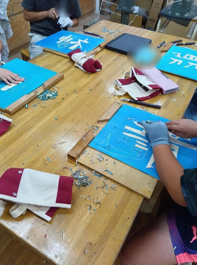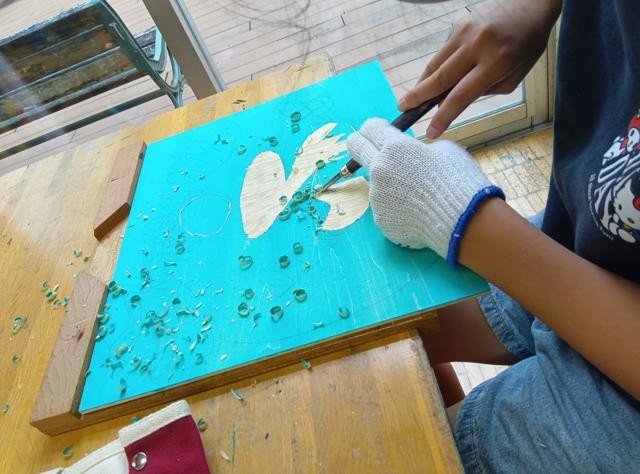 彫刻刀の使い方、見ていただくと分かると思いますが、わりと安心して見られると思います。以前は、彫る先に手を置かないことなどを指導しても、どうしてもどこかでけがが起こることがありましたが、現在は写真のように利き手ではない方の手に「軍手や手袋を付け」、できるだけ「両手で彫刻刀を持つ」ことで、物理的に切れるところに手が行かないようにしています。また板を押さえるためにどうしても軍手の手を彫刻刀から離さねばならず、うっかり前に置いてしまうという状況でも軍手や手袋をしていることでけがをしにくいようにしています。ただ軍手をしていても強く当たればもちろんけがはしますので、安全に作業ができるように安全面の指導は作業中も徹底して行っています。