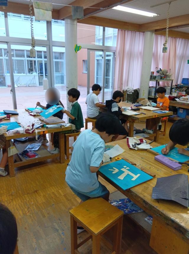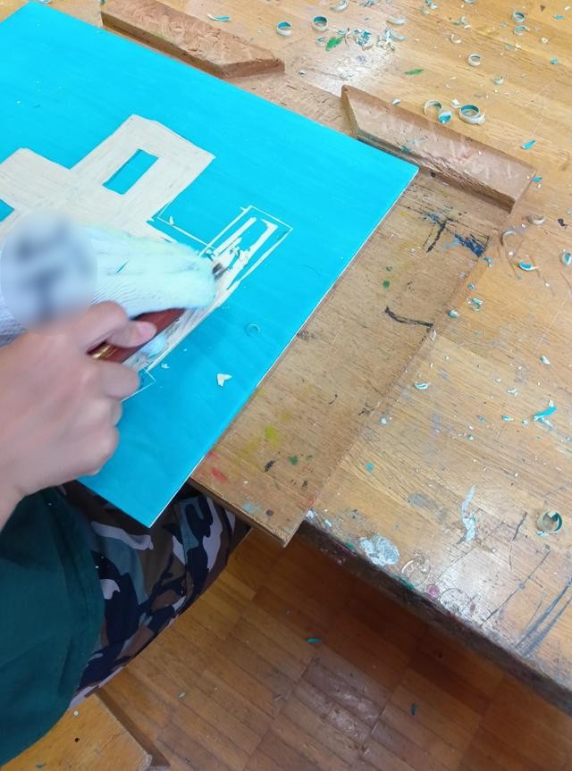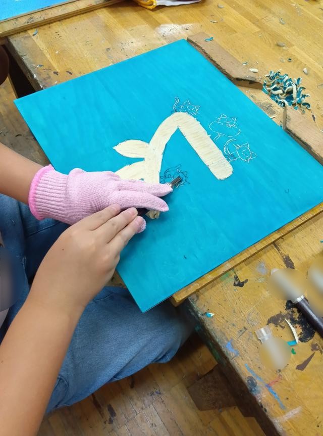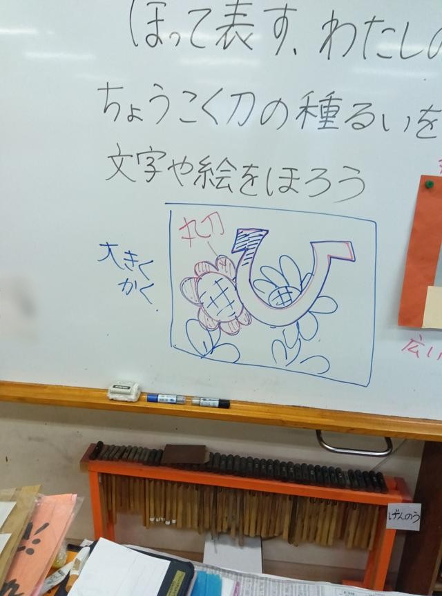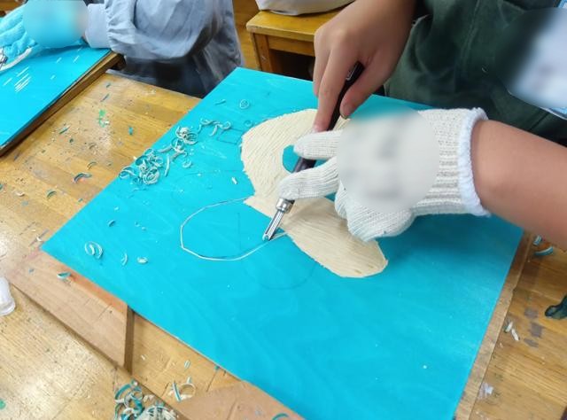 4年生の図工「ほって表す、わたしのすきな板」です。初めて使う彫刻刀を安全に、そして種類を使い分けて使えるようになるのが目標です。