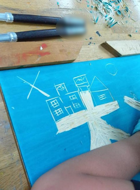 子どもたちはまだ彫刻刀に完全には慣れておらず、初めて扱う刃物を恐る恐る扱っている様子でした。「怖い」という気持ち、それだけ慎重に取り組めると思うので、いいと思います。最後まで、けがなく安全に・・・。