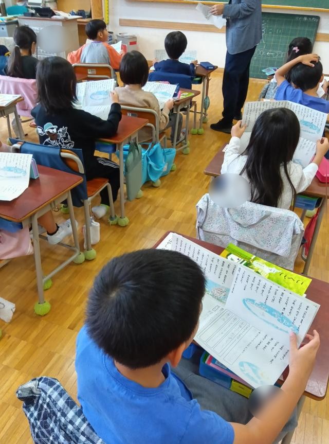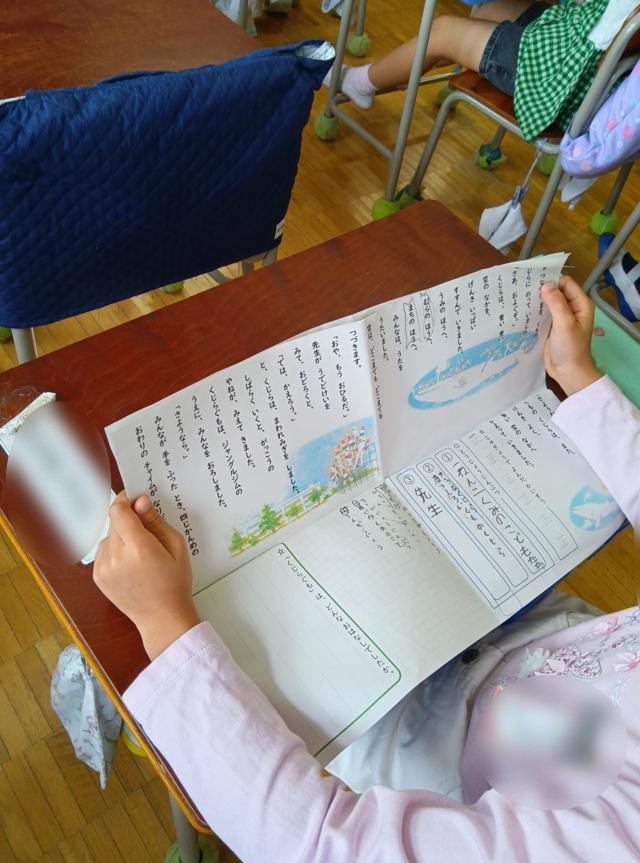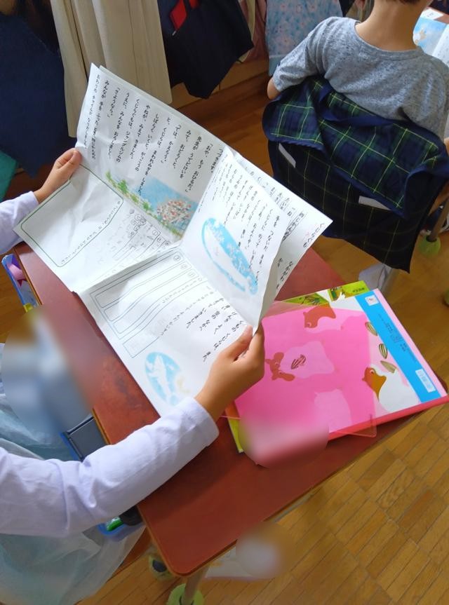 なんですが、この「くじらぐも」、お話の中では、「1年2組」の子どもたちが体験するお話になっています。2組の子たちにとってみると、「2組でうれしいな♪」ということで、登場人物のところにも、しっかり「1ねん2くみのこどもたち」と正確に書き込んでいる子もいました。「My Story」として、ちょっと自慢なんですね。