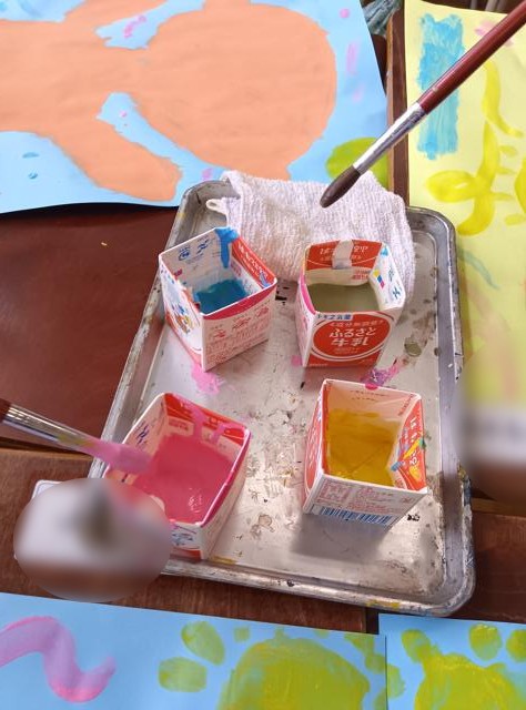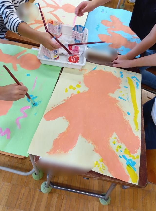 もう1つの絵は、図工で大きな画用紙に人の形を描き、周りを「せん」と「てん」で飾っているところでした。どうやら運動会に関係する作品になるようなんですが、この段階ではまだどんな風になっていくのか分かりませんでした。今後続きをお伝えしていくことができればと思います。