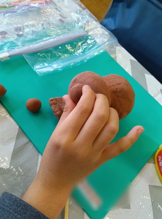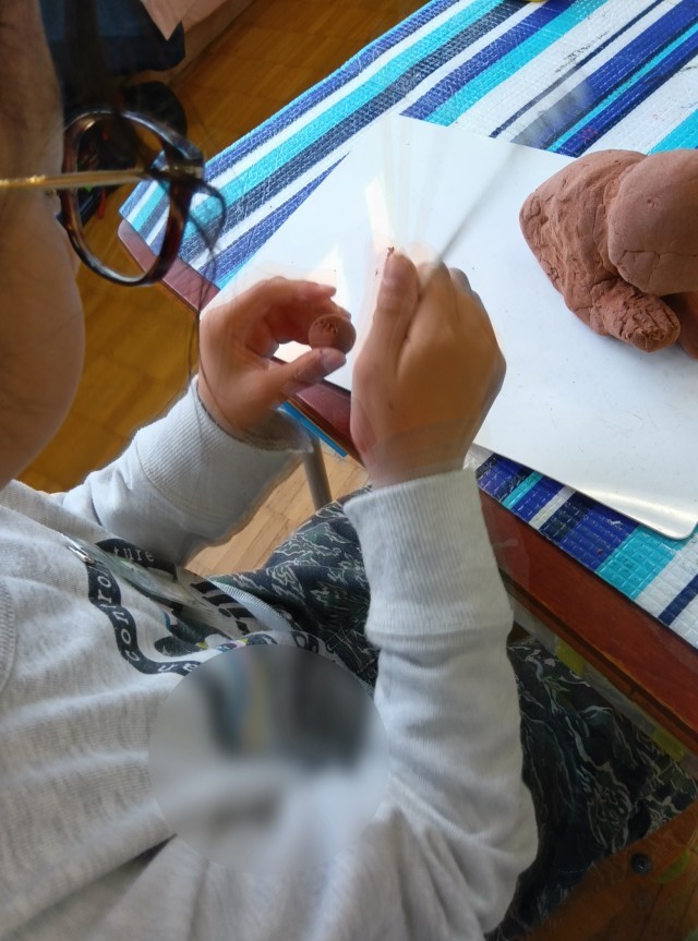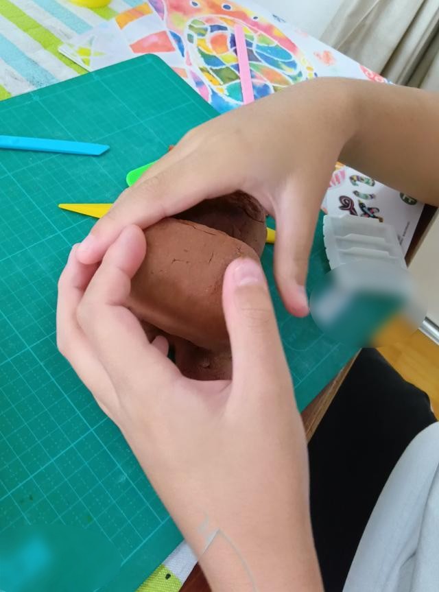 この前お伝えしましたが、ボディは新聞紙を丸めた紙を芯に使い回りを粘土で覆って形にしています。その分、顔のパーツには結構粘土を使います。