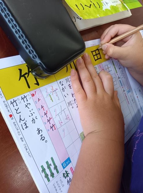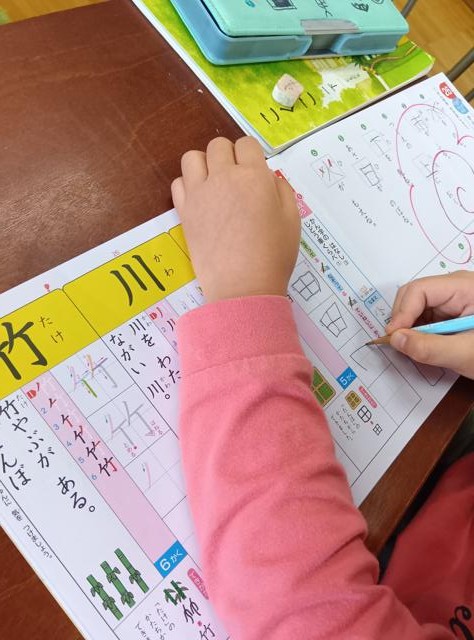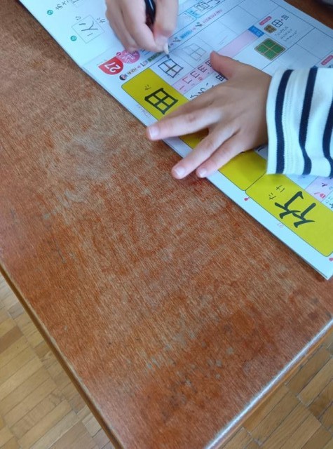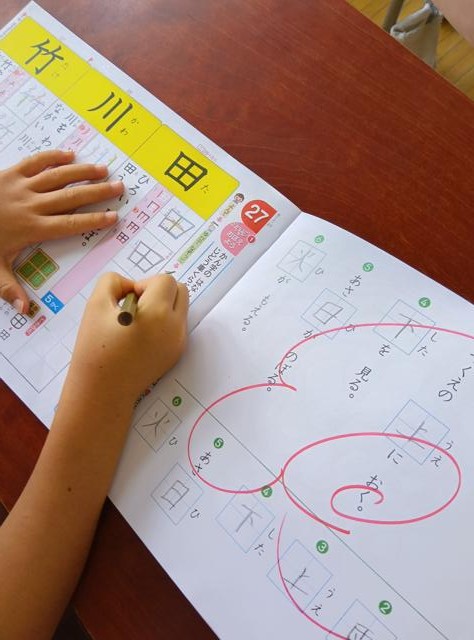 さて、毎日少しずつ学習している漢字の学習、順調に進んでいます。昨日は、「田」と「川」を習っていました。先生のお手本を見て、空書きをし、なぞって、書いて・・・じっくり練習していました。