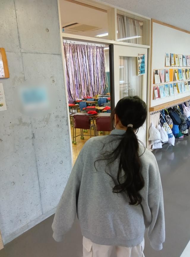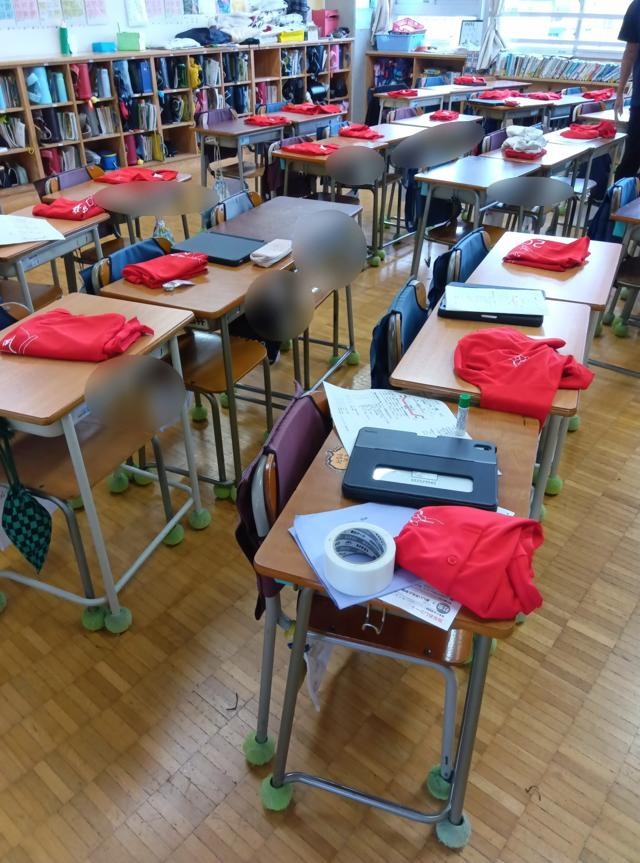 (写真2枚目)ある子が隣の学級を覗き込んでいます。何があるのでしょう。教室の中、子どもたちの机の上には、赤いポロシャツが置かれていました。
