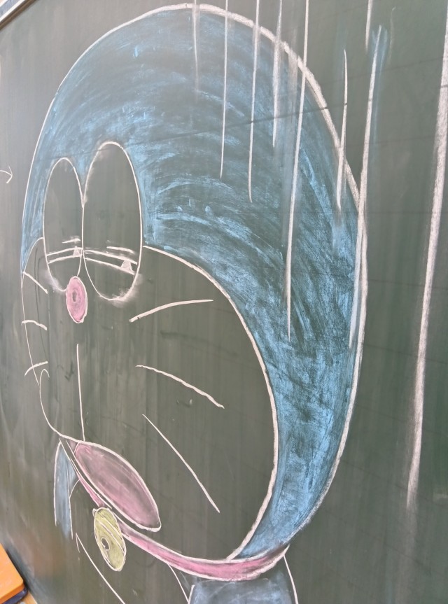 子どもたちが描いたものは金曜日の日中、教員が描いたものはおそらく金曜日の放課後に描かれたものです。・・・そうなんです。今日、授業を行うにあたって、この黒板の絵をどうするか・・・これはこの状況になってみないと分からないことでした。黒板を使わないでも授業はできるので、黒板を使わなかったり、一部制限して使ったりしたと思います。