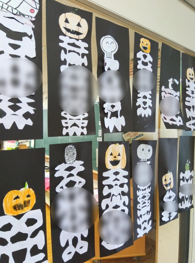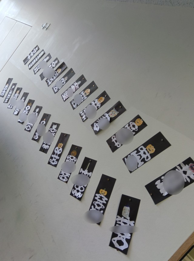 3年生の廊下やドアに掲示されています。ハロウィーンの飾りだったんですね。名前が左右対称で並んでいる姿が、ガイコツのようにも見えます。というよりもぱっと見ガイコツにしか見えないですね。おもしろいアイデアです。カボチャなどの飾りも付けて完成したようです。ようく見ると名前も見えてくるので一応、一部ぼかしました。