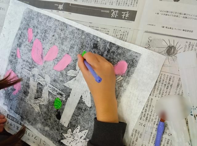 4年生の図工「ほって表す、わたしのすきな板」の続きです。刷った紙に色を付けていました。刷った面の裏面に絵の具で大まかに色を付けています。「大まかに」というのは、表面で色が出るところは白いところだけで、黒いところは表から見るとそのまま黒を保つからです。「漢」の字が表裏の写真があり分かりやすいかもしれません。丁寧に塗っていますが、もっと大まかに塗っても表の見た目は変わりません。「うら彩色」と言います。その文字や柄のイメージも考えながら彩色をしていました。直接塗るよりもきれいなのがミソです。そして、刷りでは出ない白いところに色が付くというのもおもしろいですね。
