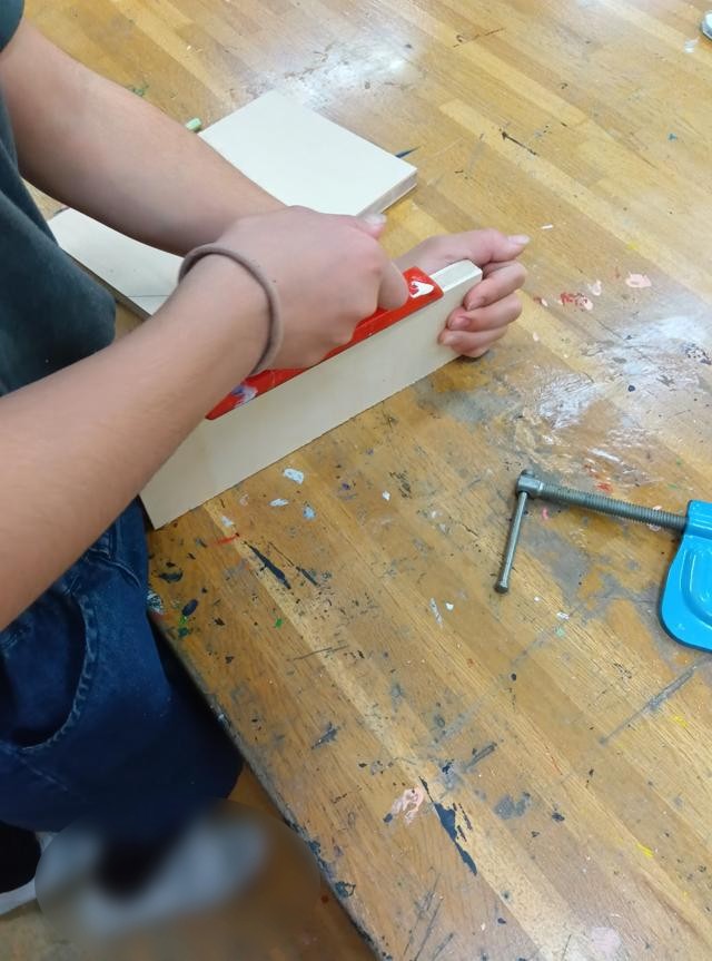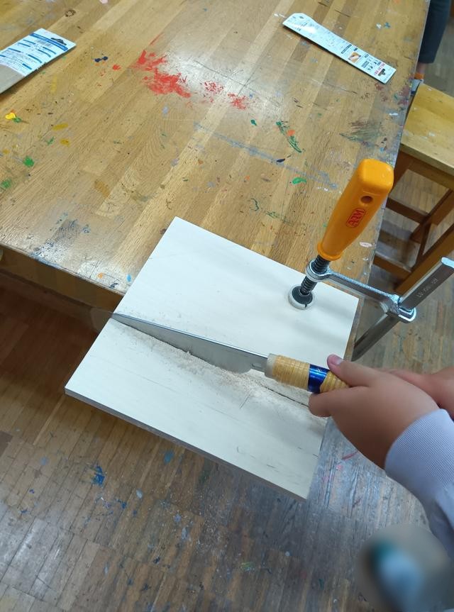 後半は、別の教材で板を切っていました。3年生でも扱ったでしょうか、引くところにしっかり力を入れて上手に切ることができていました。こちらはどんな作品になっていくのか、今後追いかけていきたいと思います。