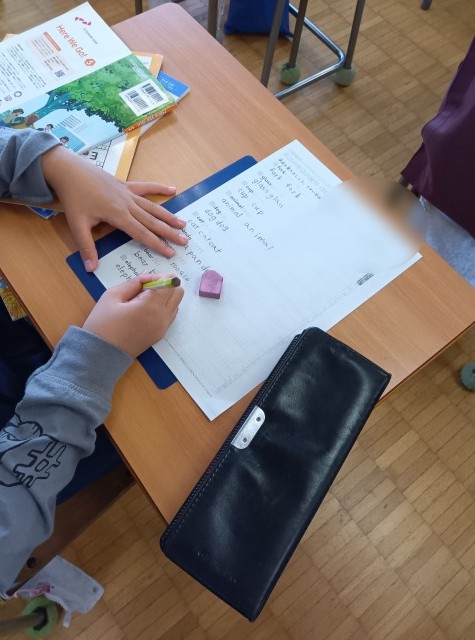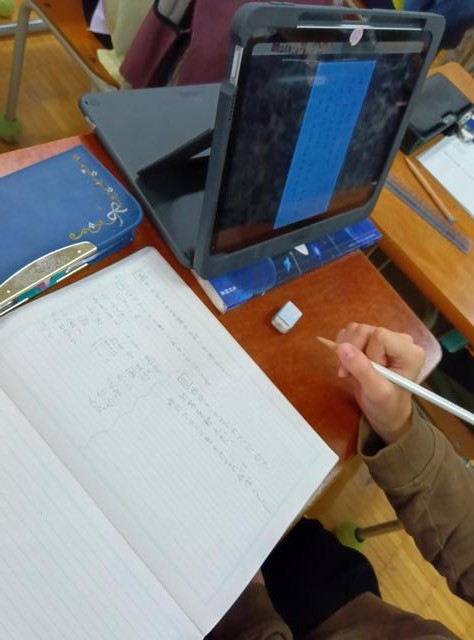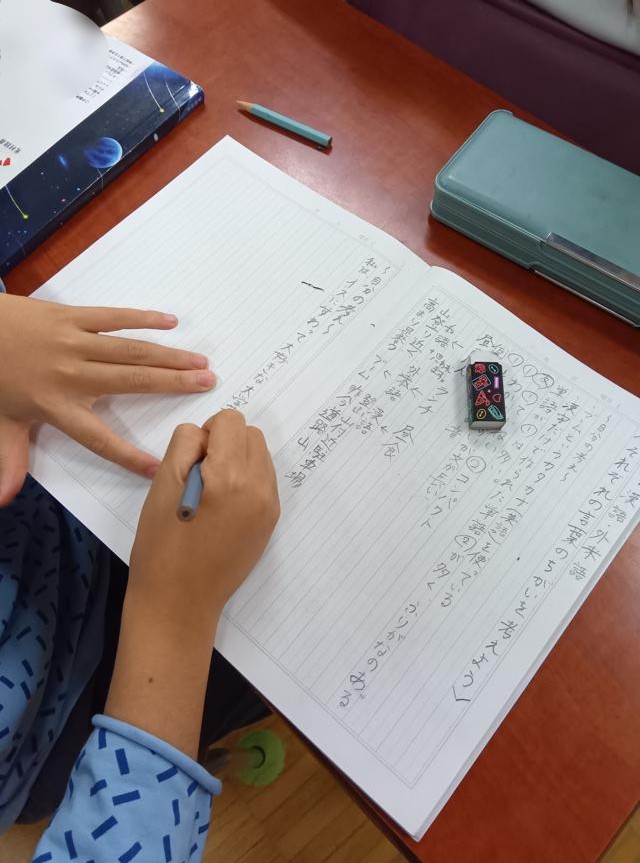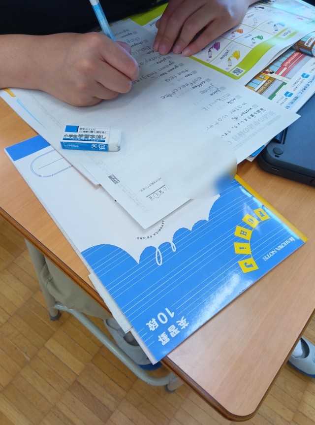 言葉関連で、後半の写真は、外国語の授業で、ライティングの練習をしている5年生です。
