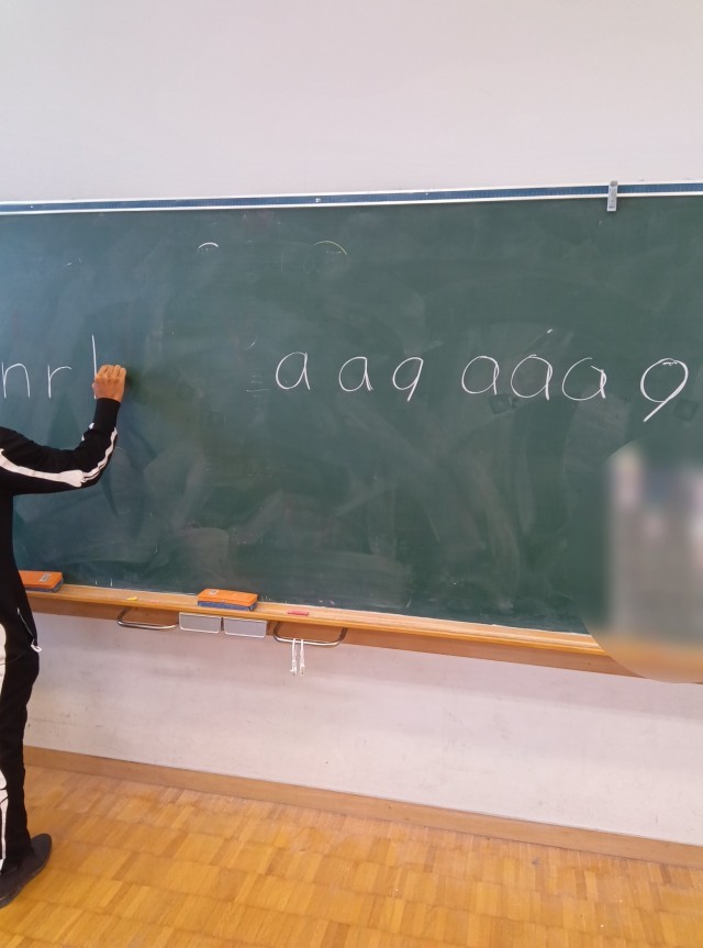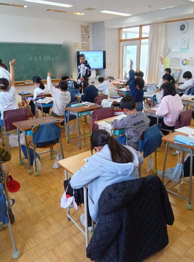 先日6年生でも「書く」学習の様子をお伝えしましたが、5・6年生の外国語の授業では、書くことも大切にして学習しています。先生が間違えやすいAアルファベットをしっかり書けるように黒板に書いています。みんなきれいに書けていて感心しました。