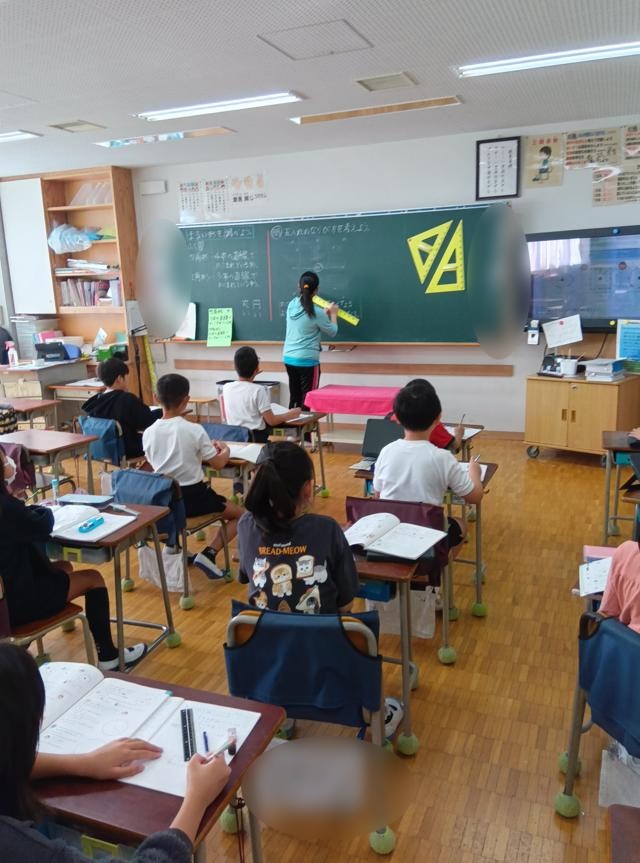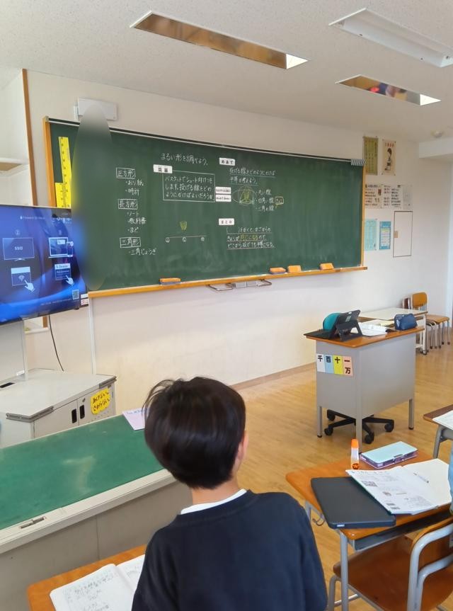 3年生が算数で、「円」の学習をしていました。その導入で、先日の運動会で1・2年生が行った「玉入れ」を使って考えていました。1・2年生の玉入れ、かごの下に円が描かれていて、その外側から投げるルールでした。もしもこれが「円」ではなく、「三角形」や「四角形」だったらどうでしょう。角のとんがった位置など、場所によって遠くなったり、近くなったりして不公平になります。円がないと困るのです!これはまさに円の定義に関係する大切なポイントです。