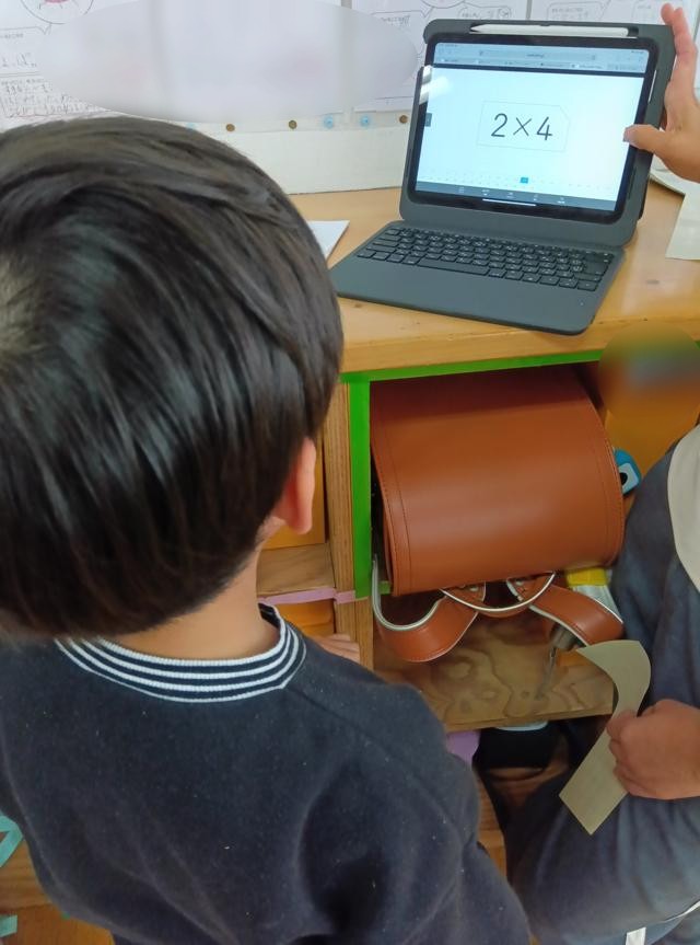 学習が終わった段から、まずは「九九順」にすらすら言えること、それができたら「逆」にすらすら言えること、最後は「ランダム」に出されてもすらすらと言えること、そこまで合格して、その段の検定突破となります。タブレット端末でフラッシュ計算のように表示された九九に答えていました。待っている子たちは、プリントやカードを使って練習中です。