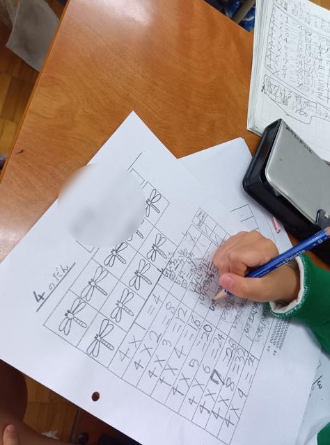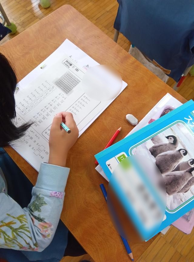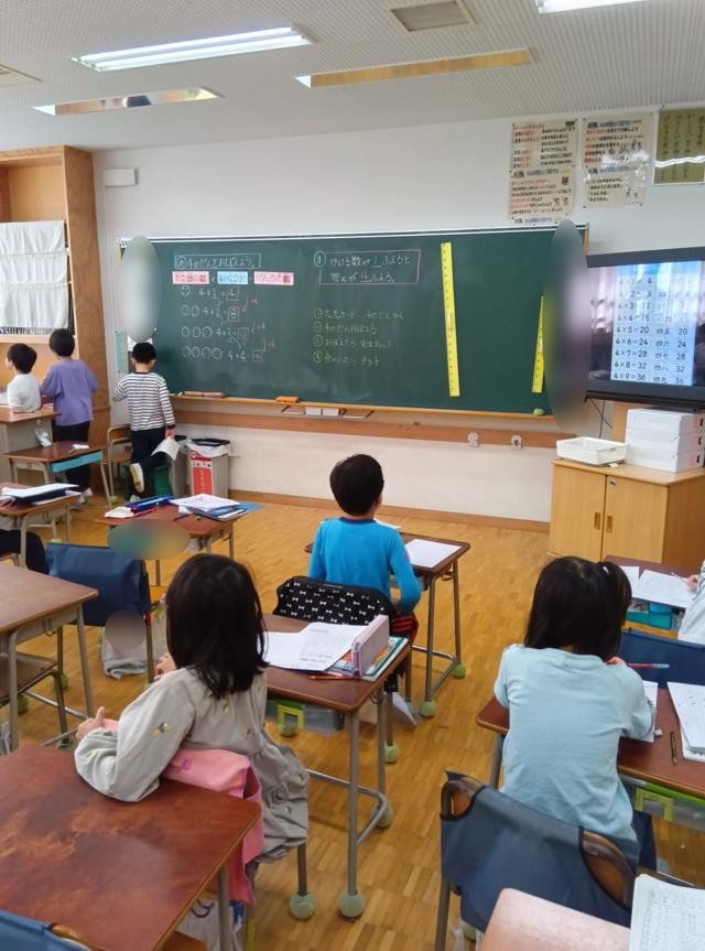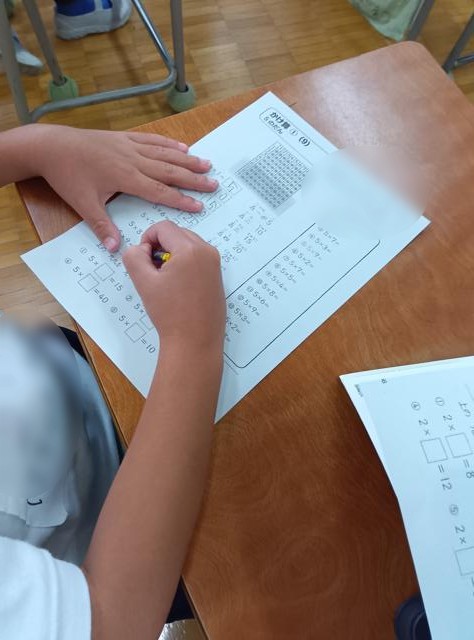 九九を学習し始めた2年生、この日は九九検定をしていました。今回の写真の中には写っていませんが、検定の表があり、合格したら印、サイン、シール(すみません、現物がないのでどれかは分かりません)などをもらっていきます。
