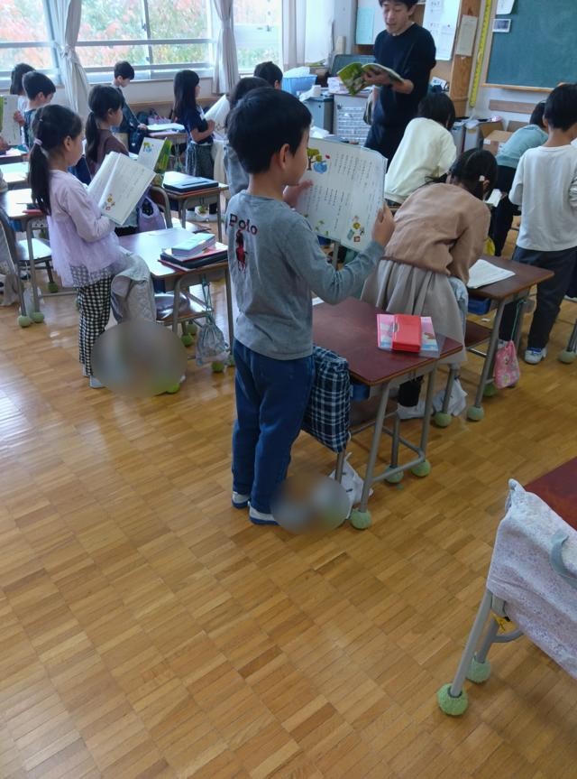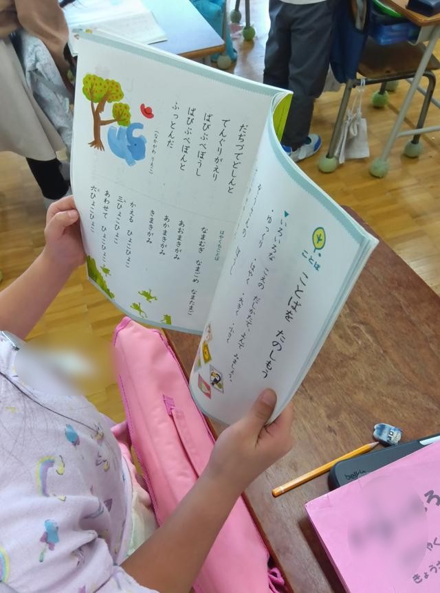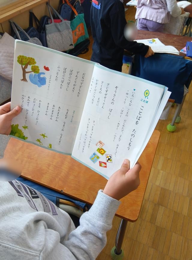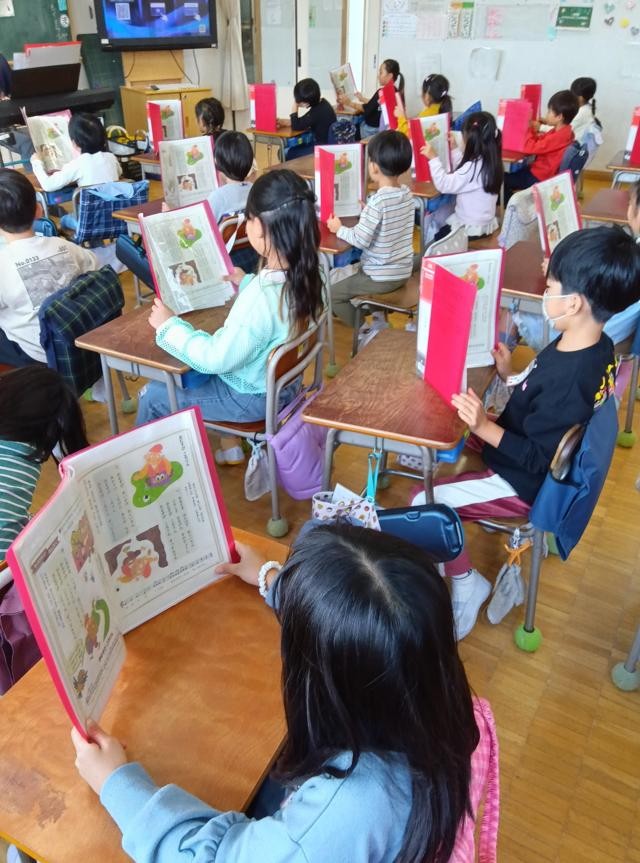 それから、後ろの方の写真は、お話ではないんですが、みんなでそろって音読をしていて、そのリズムのよさに思わず惹かれて教室へ♪語呂がよく、読みやすいので、子どもたちも元気いっぱいで読んでいます。何だかこちらも楽しい気分になりました♪