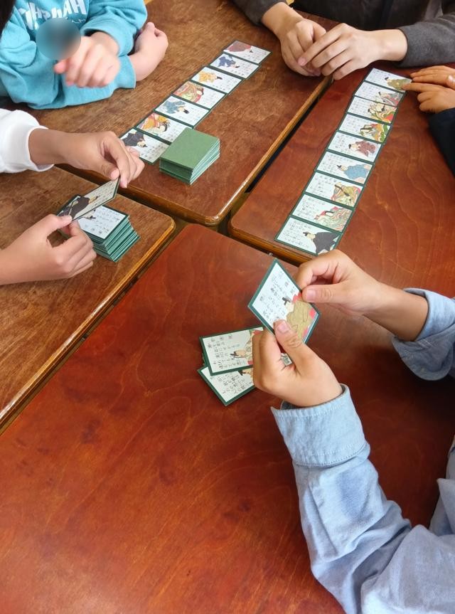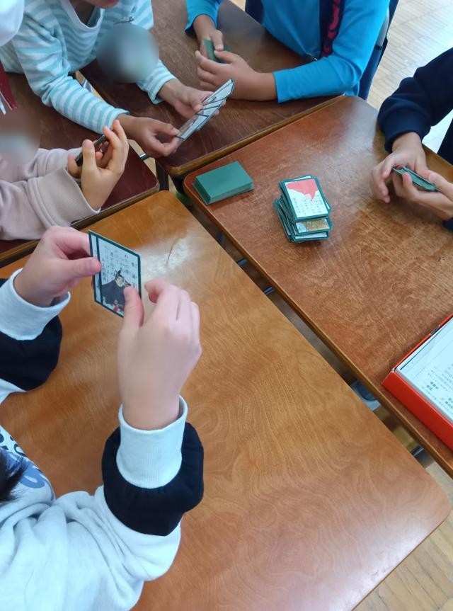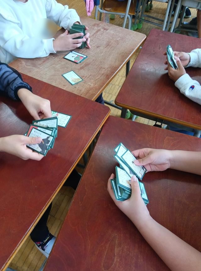 2年生が日本語で「短歌」の学習をする導入で、百人一首をしていました。といってもこの日やっていたのは、「坊主めくり」です。坊主めくりなので、絵柄に目が行きがちですが、一緒に歌にも目を向け、短歌の学習に入っていってほしいと思います。