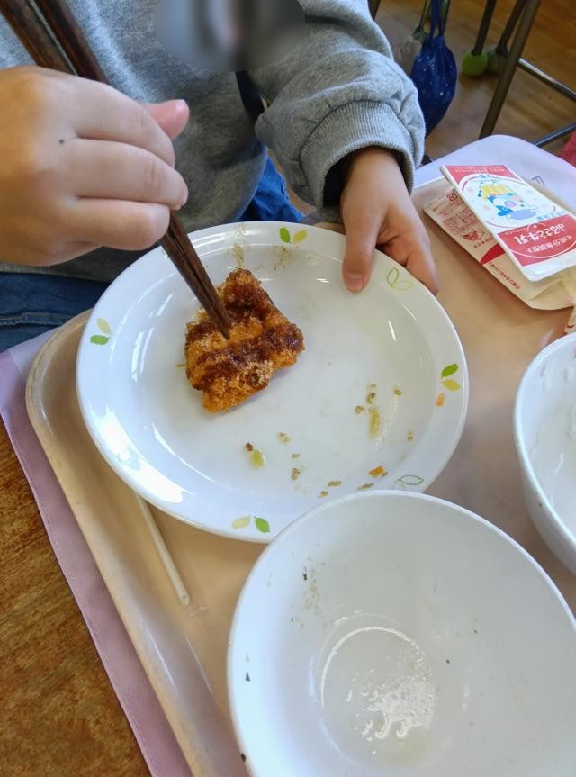 ちょっと給食の終わりがけですが、1年生の教室に行ってみると、食べ終わっている子が多かったですが、何人か食べている子がいて、どの子も最後にチキンカツを残していました。どうやら、好きなものは最後に食べる派の子どもたちとおかわりを勝ち取った子たちだったようです。うれしそうに食べていました。どの教室でも残っていなかったです。チキンカツ旋風!(は言い過ぎ?あ、10日月曜日はあげパンです♪)