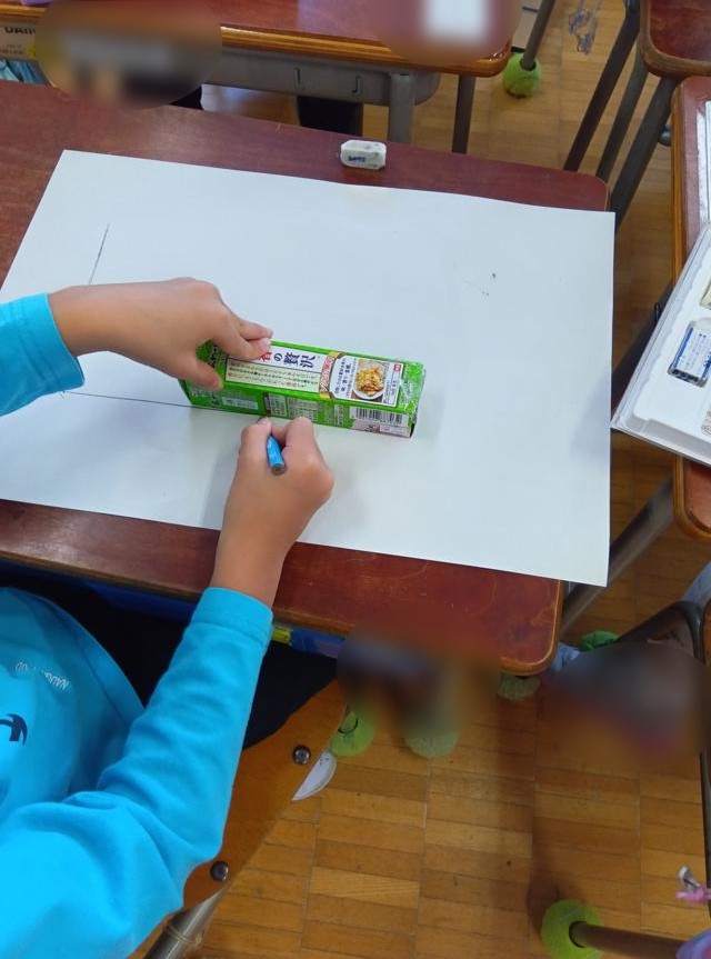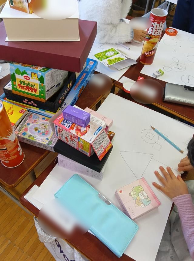箱の形の学習をしている1年生、この日は、箱の「面」の形に注目をした学習をしていました。